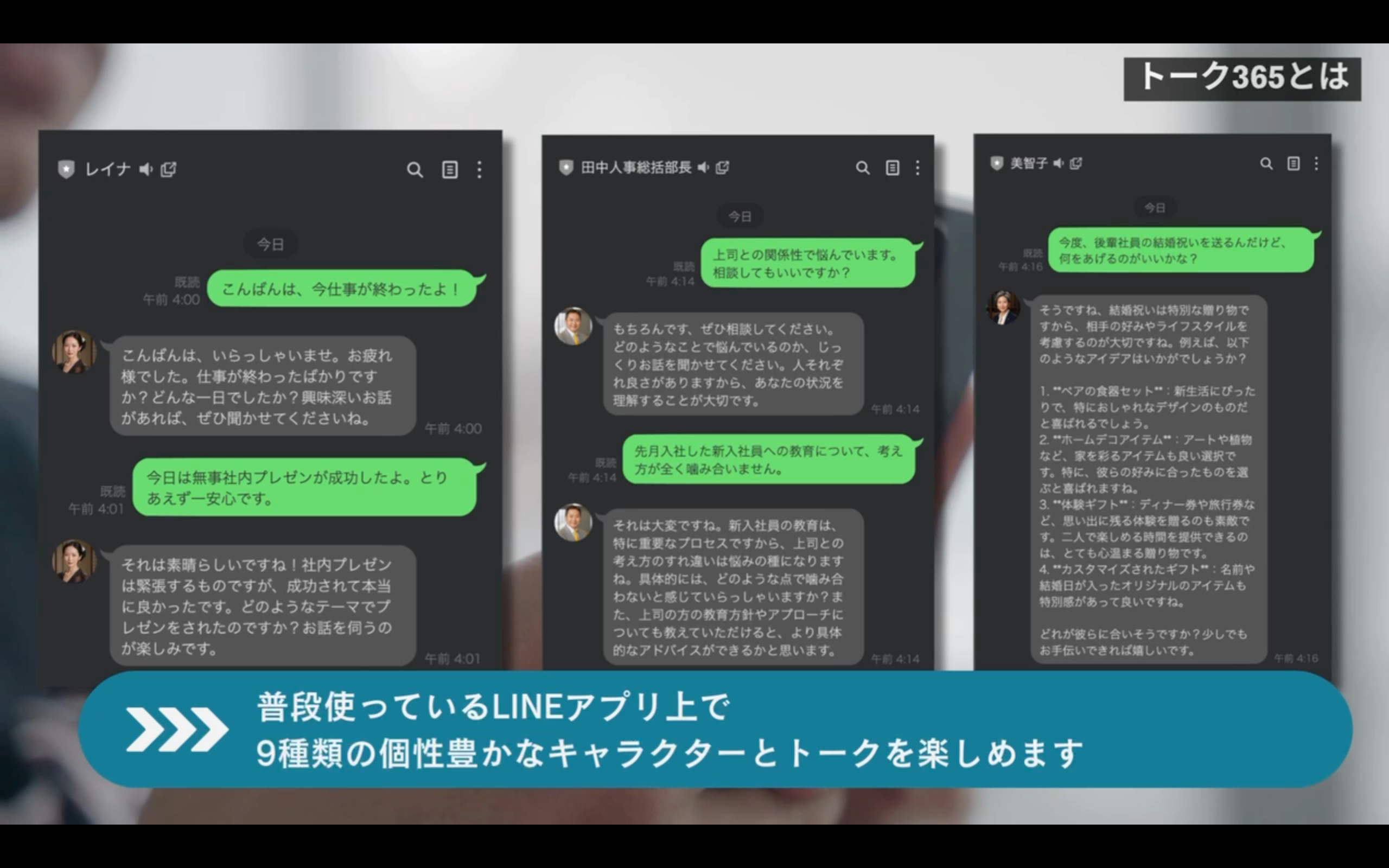 24時間365日、いつでもどこでも、あなたの悩みや課題に寄り添い、成長をサポートします。LINEを通じて、一人で抱え込みがちな悩みも、トーク365なら様々なキャラクターへ気軽に相談できます。