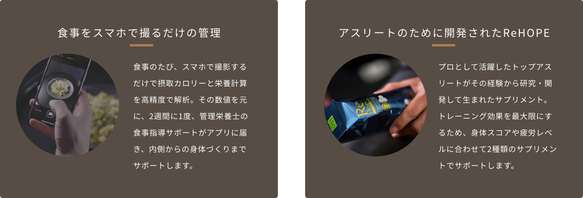 プロとして活躍したトップアスリートが、その経験から研究・開発して生まれたサプリメント。トレーニング効果を最大限にするため、身体スコアや疲労レベルに合わせて2種類のサプリメントでサポートします。