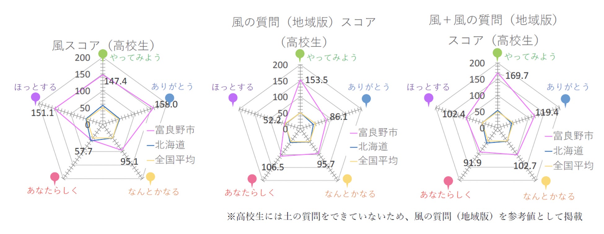 ふらの(高校生)は、風スコアの「あなたらしく」を除いて、いずれの項目も全国平均(一般市民)、北海道平均(一般市民)より高いスコアでした。