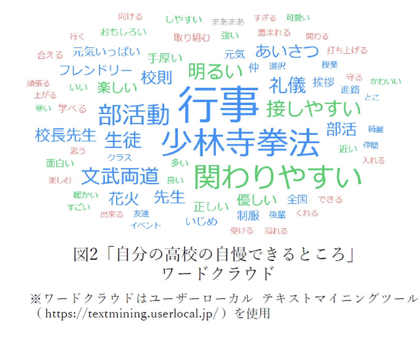 高校生については別途、自分の高校の自慢できるところをたずねており、行事や部活動の充実、関係性や挨拶などを挙げる声が多く見られました。