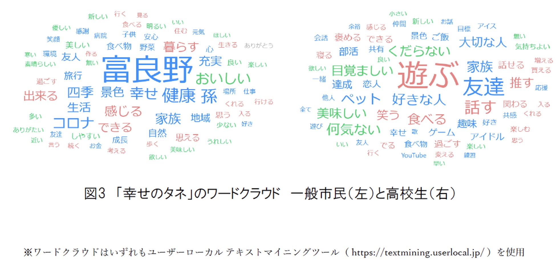 そして、ふらのに住む人たちがどのようなことにしあわせを感じているのか自由記載でたずね、延べ822個(一般市民/高校生から延べ 551個/271 個)の「幸せのタネ」が寄せられました。
