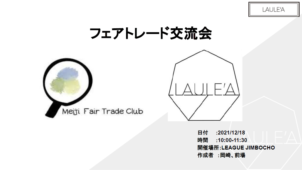 オーガニックセレクトショップ LAULE'A(東京都千代田区、運営:株式会社マルラニ、代表:高橋真希、以下ラウレア)は2021年12月18日(土)、フェアトレードという活動を通して途上国などの貧困、環境問題、児童労働を解決するという目的で発足されたMeiji Fair Trade Club(以下MFTC)と合同で、フェアトレードに関する理解を深め、具体的な取り組みを実践していくための交流会を開催いたしました。