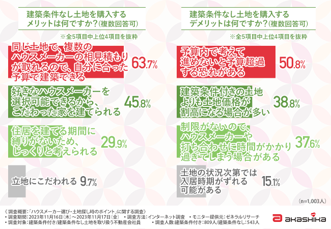 対する建築条件なし土地では、予算や好みに合ったハウスメーカーが選べる一方、予算がオーバーする可能性が高いことも明らかになりました。