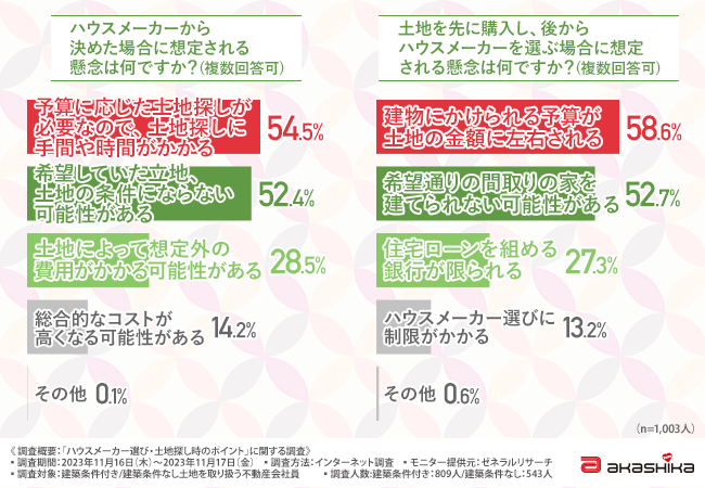 次に、土地をまず購入し、後からハウスメーカーを選んだ場合に想定される懸念を伺いました。