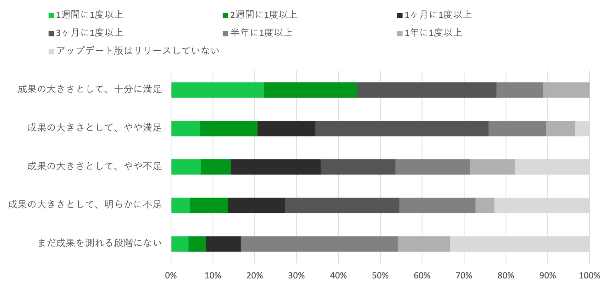 プロダクトをリリースし、成果に満足している対象者は、2週間に一度以上アップデート版をリリースしている割合が高い。