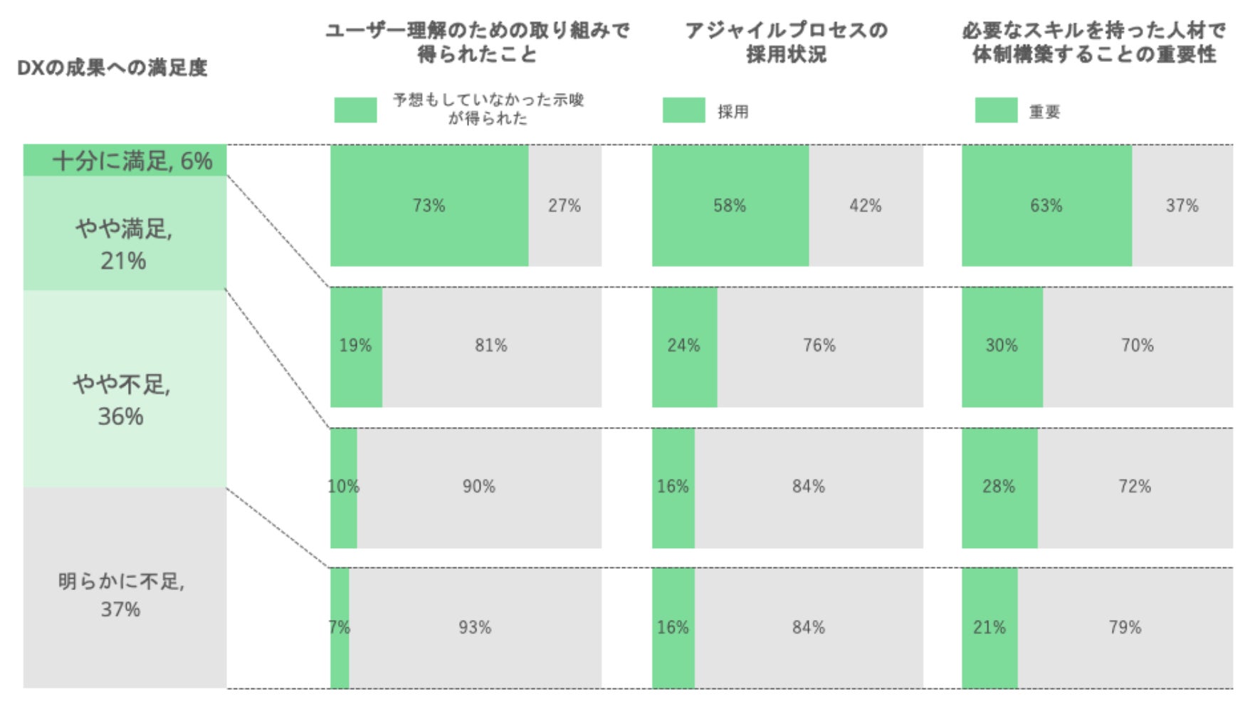 DXの成果に「十分に満足」している層のうち、「ユーザー理解のための施策で予想もしていなかった示唆が得られた」とする回答者が73%。成果に「やや満足」〜「明らかに不足」の層(12%)と比較し、大きな差があることが分かった。