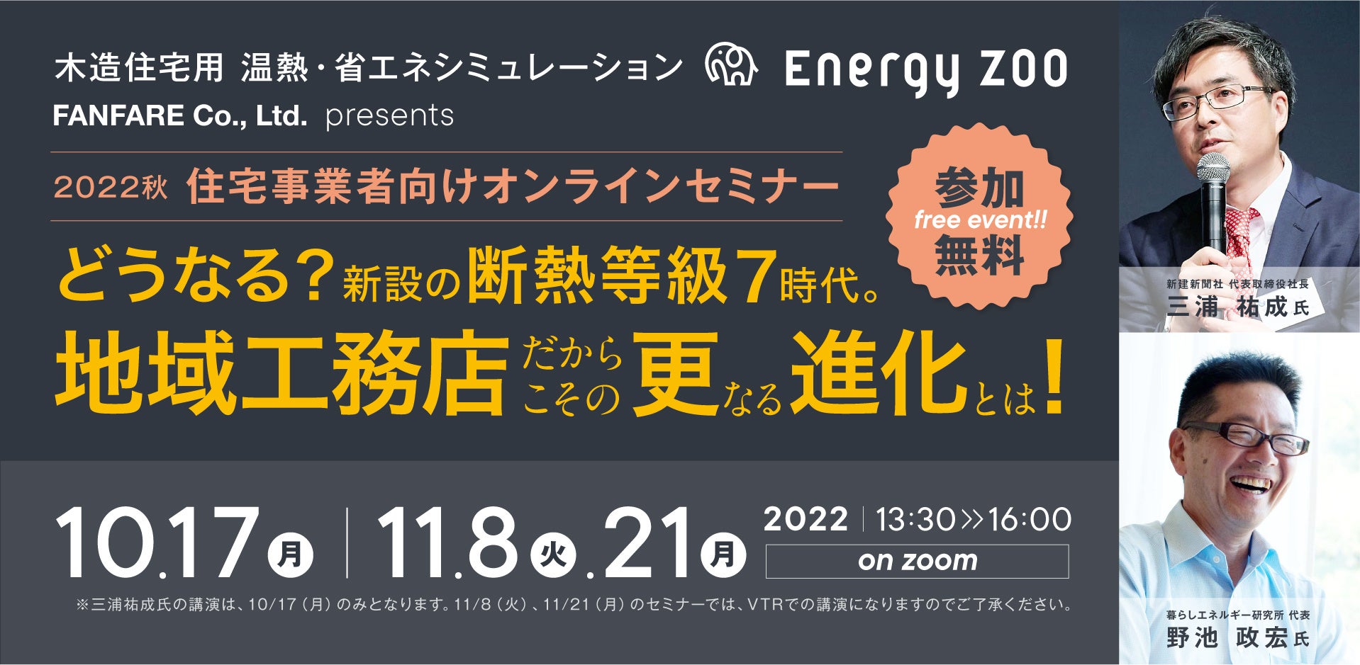 温熱・省エネシミュレーション「Energy ZOO」(エナジーズー)を開発・運営するFANFARE Co., Ltd.(福岡県福岡市、代表取締役 梶原清悟、以下「当社」)は、2022年11月より研修や動画を使用した新サービスを開始します。それに伴い、2022年10月17日(月)、11月8日(火)、11月21日(月)に住宅事業者向けオンラインセミナーを開催いたします。