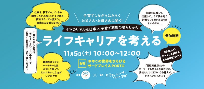 lavieestbelle株式会社(本社:神戸市中央区、代表:佳山奈央)は、令和4年度「CO+CREATION KOBE Project(民間提案型事業促進制度)」の採択事業として、運営する保育士常駐の室内遊び場・親子向けのコミュニティスペース「おやこの世界をひろげるサードプレイスPORTO」(神戸市中央区)にて、一般社団法人大学コンソーシムひょうご神戸の協力を得て、大学生向けのトークイベント「イマのリアルな仕事×子育て家族の暮らしから ライフキャリアを考える」を2022年11月5日(土)に開催します。
