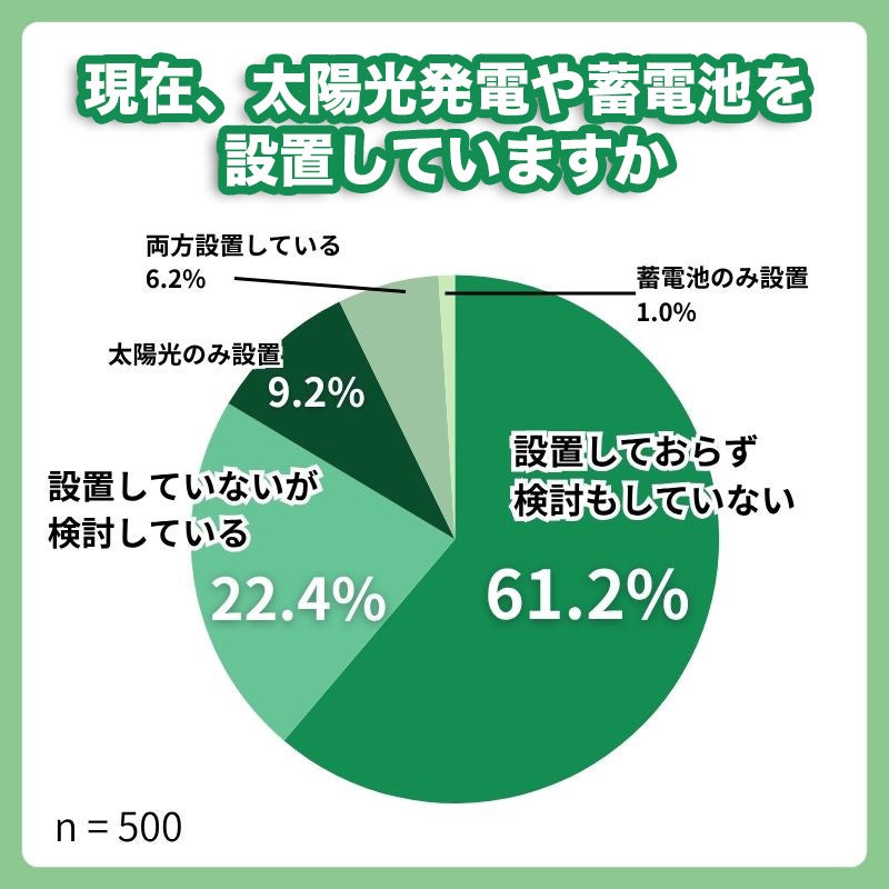 一方で、「設置しておらず検討もしていない」家庭は61.2%と依然多数派ですが、電気代高騰が続く中で、「電気を買う」から「自分でつくる」へ意識をシフトする動きが見られます。
