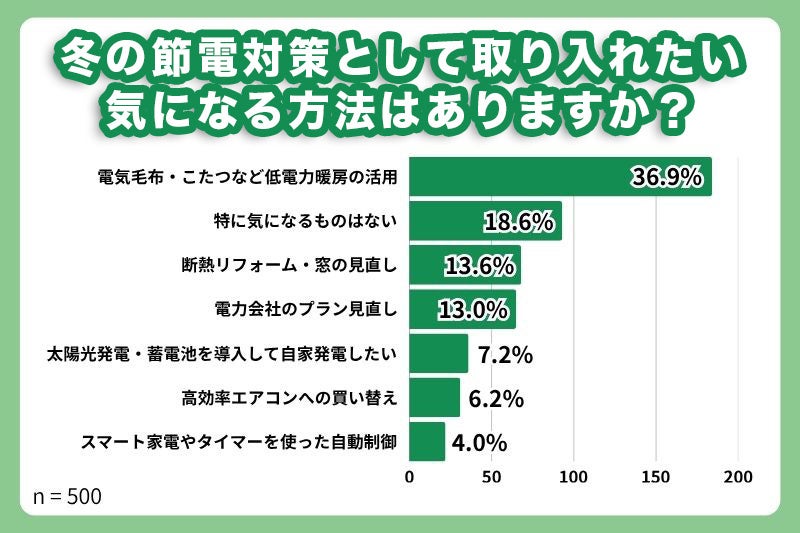 「冬の節電対策として、取り入れたい・気になる方法はありますか?」という質問では、「電気毛布・こたつなど低電力暖房の活用」36.9%が最も多く、節電と快適さを両立できる方法として関心が高いことがわかりました。