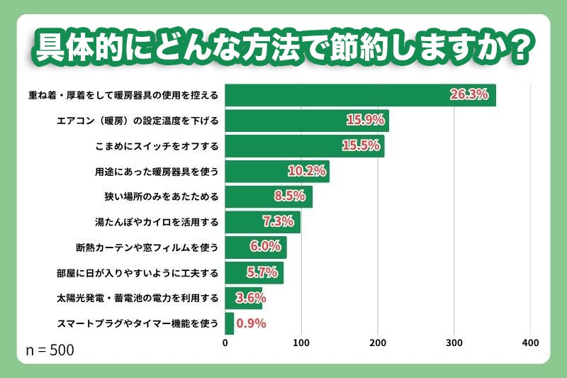 「具体的にどんな方法で電気代の節約をしますか?」という質問では、「重ね着・厚着をして暖房器具の使用を控える」(26.3%)が最多となり、次いで「エアコン(暖房)の設定温度を下げる」(15.9%)、「こまめにスイッチをオフする」(15.5%)が続きました。