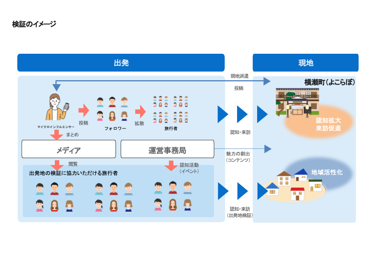 数ヶ月間に渡り、横瀬町内でのマイクロインフルエンサーを活用した観光資源の発信と創出による、ターゲット層の動き(どの程度認知するのか、どの程度来訪するか、どれくらいの期間を要するか、来訪する層はどういった特徴を持つのか、など)の検証を行います。