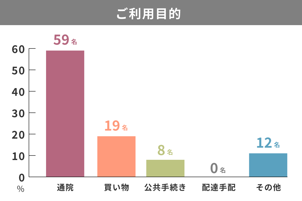 利用目的で最も多かった目的は病院への通院で、次に買い物となっており、日常の生活に根ざした移動のニーズが高い事が覗えたことに加え、今後追加して欲しい行き先として、病院やクリニック、スーパーなど、日常生活における身近な移動手段としてのニーズが高いことが分かりました。
