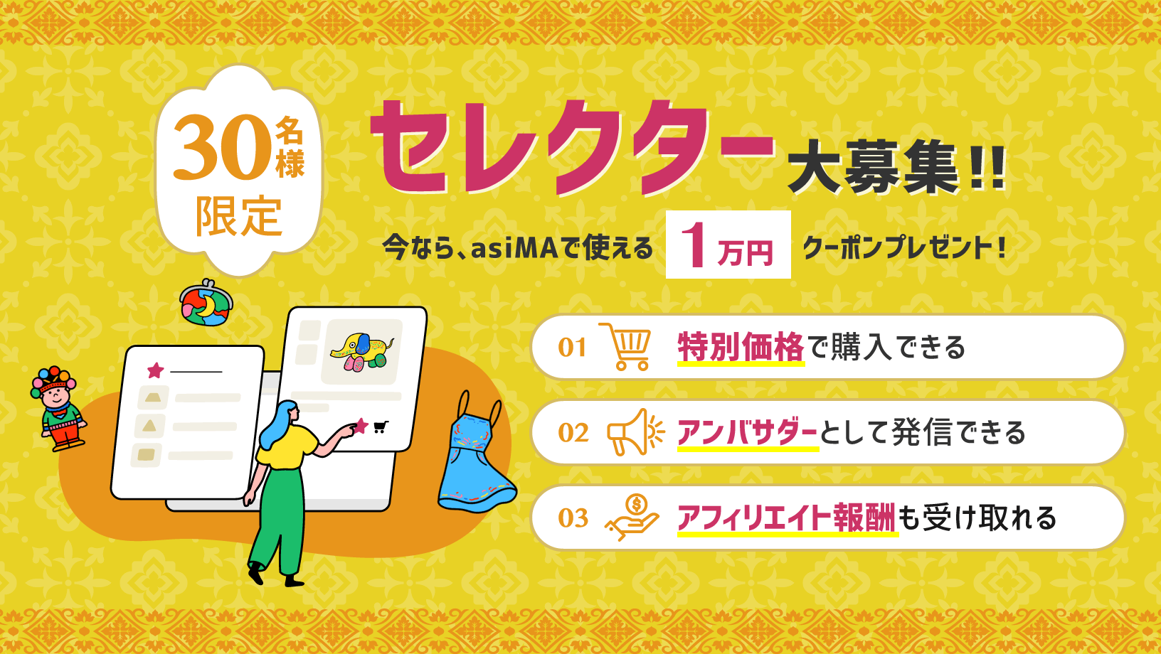 越境ECの「アジアを旅するマーケットasiMa(アジマ)」は、タイ好きやアジアン好きの方々がセレクター報酬(アフィリエイト報酬)を受け取る仕組みにより、「好きなことで生きる」のをサポートします。