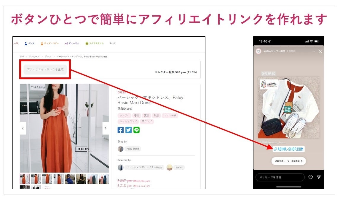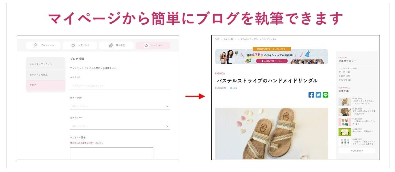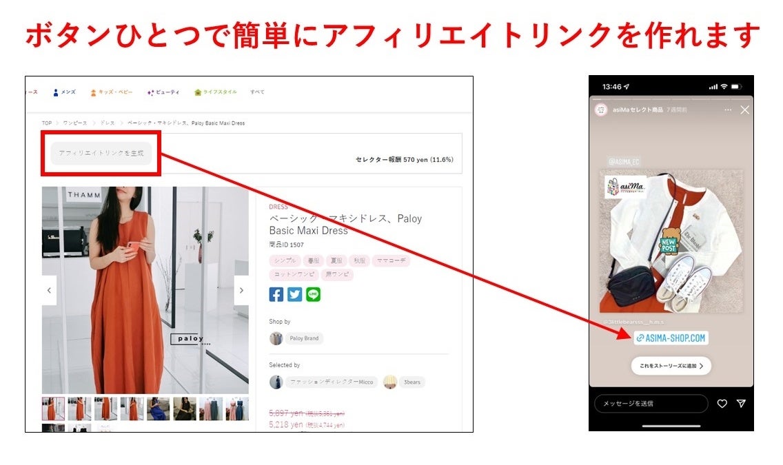 ②アンバサダーとしてasiMa上でブログを書いたり、他サイトやSNSに商品紹介リンクを貼ったり、商品とasiMaを紹介できる