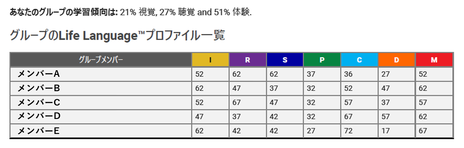 | 上記に加え、仕事のスタイル・リーダーシップの発揮の仕方、ストレスへの耐性や反応として表れる行動、自然に学習できる方法、自己肯定感レベルなど、様々なコミュニケーション傾向が分かります。7つの言語を詳細に理解することで、コミュニケーションの食い違いも減り、人との違いをより受け入れることができるようになります。 |