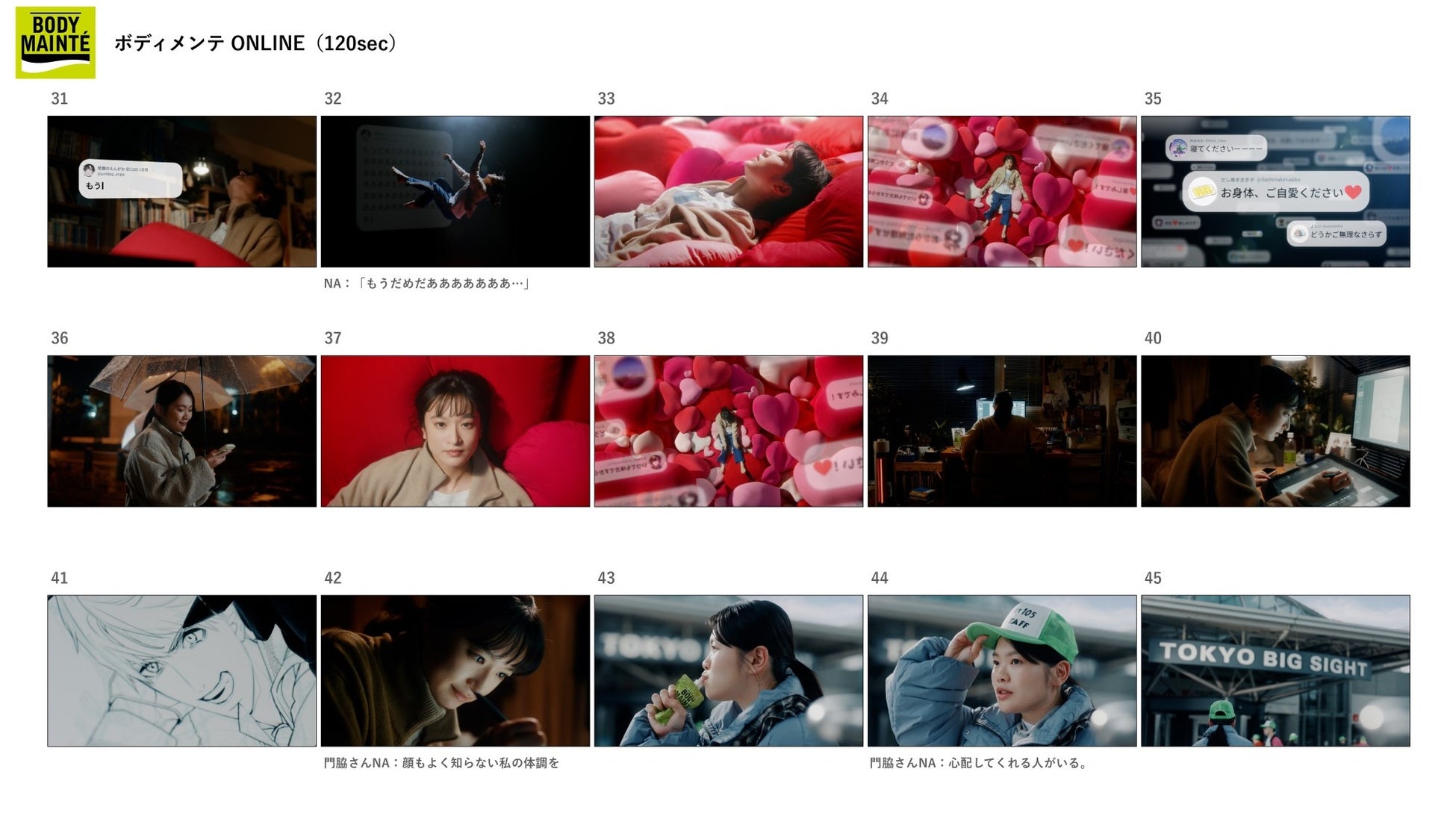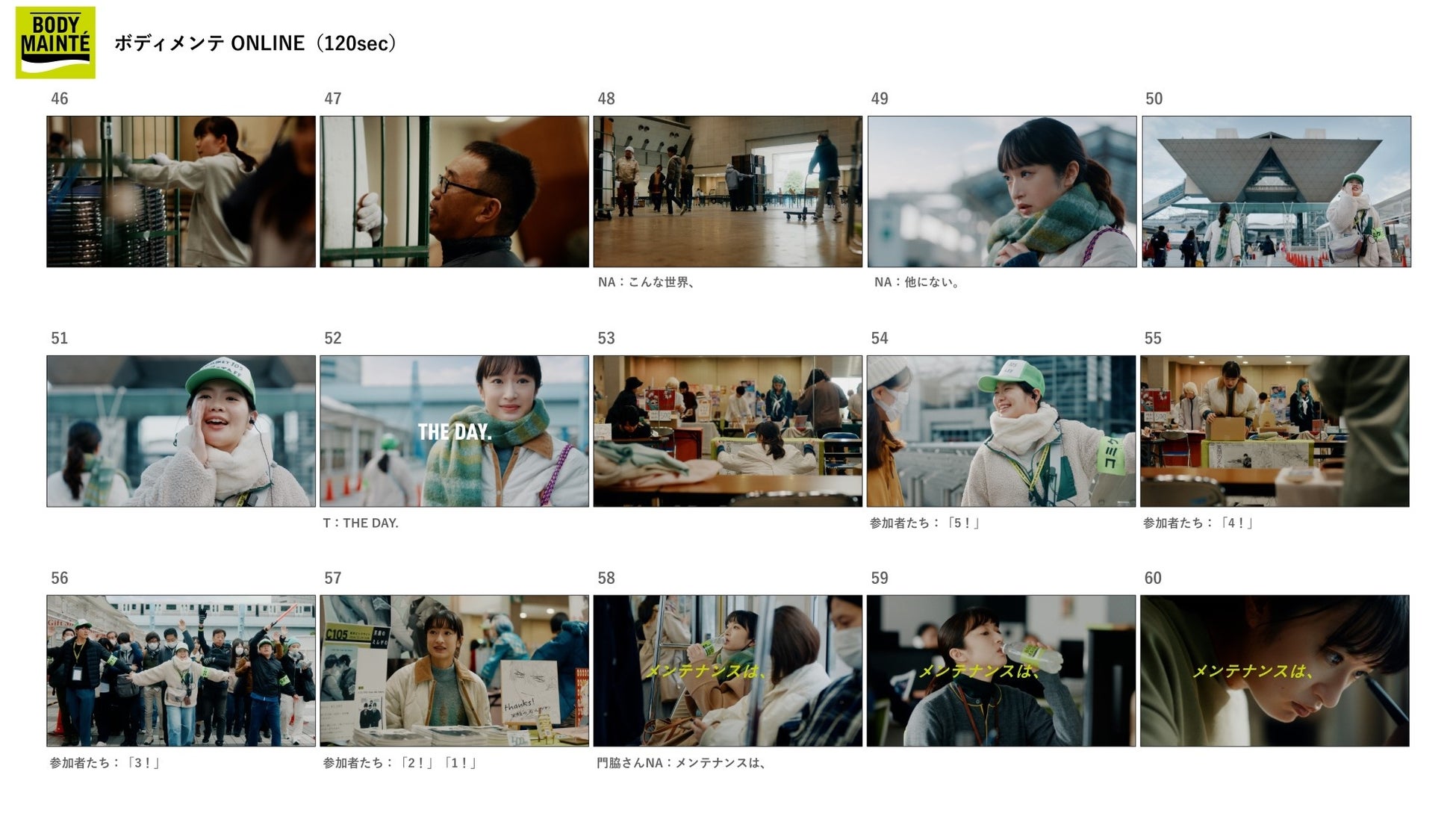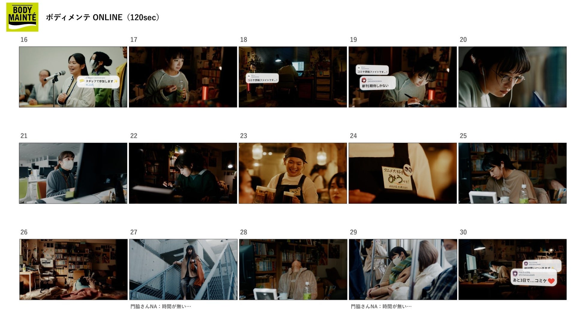 コミケは設営や誘導など、その運営のすべてが多くの人々の協力によって成り立っており、本CMでは、準備会を経て自らコミケに参加するファンの姿も描いています。作家だけでなく、関わる人全員が参加者としてコミケ当日の「THE DAY.」へ挑む姿を映し出すことで、ボディメンテが大事な日に向けて準備をする日常の体調管理に寄り添うことを表現しています。