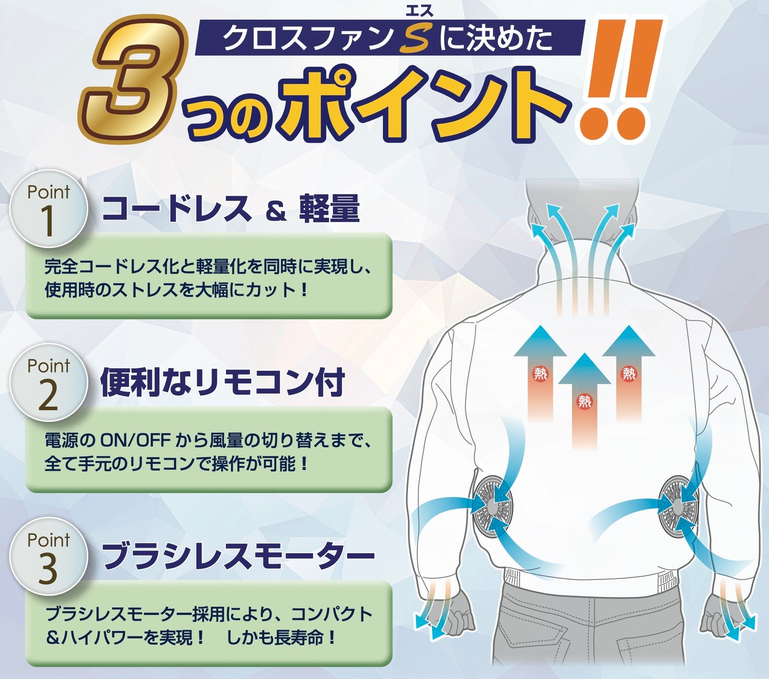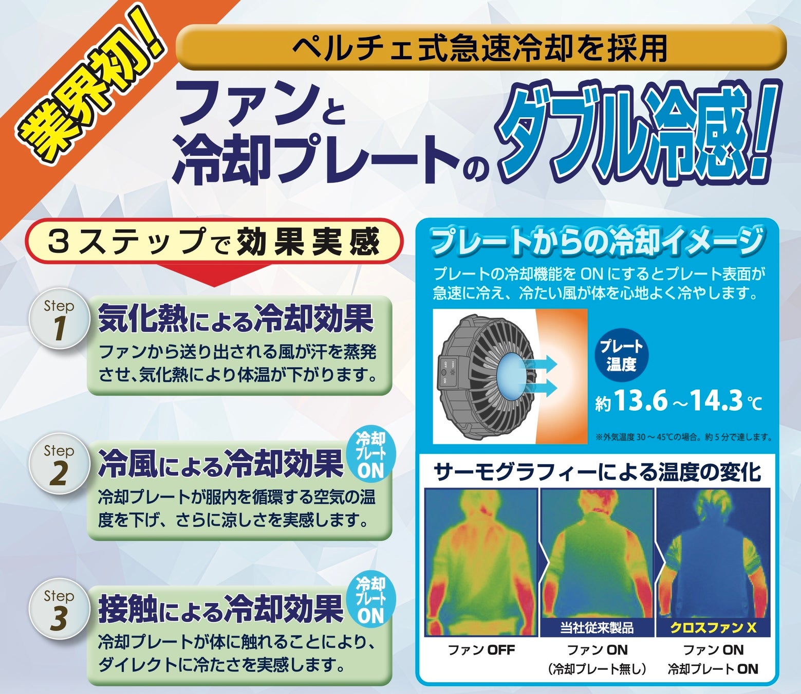 ファン付きウェアの従来からの課題であった「配線・バッテリーの別途所持を無くしたい」方は『Cross-fan S』、より暑い環境下でのご使用など「風と冷媒の、ダブル冷却方法」で快適性を求める方は『Cross-fan X』で、夏の猛暑対策を!