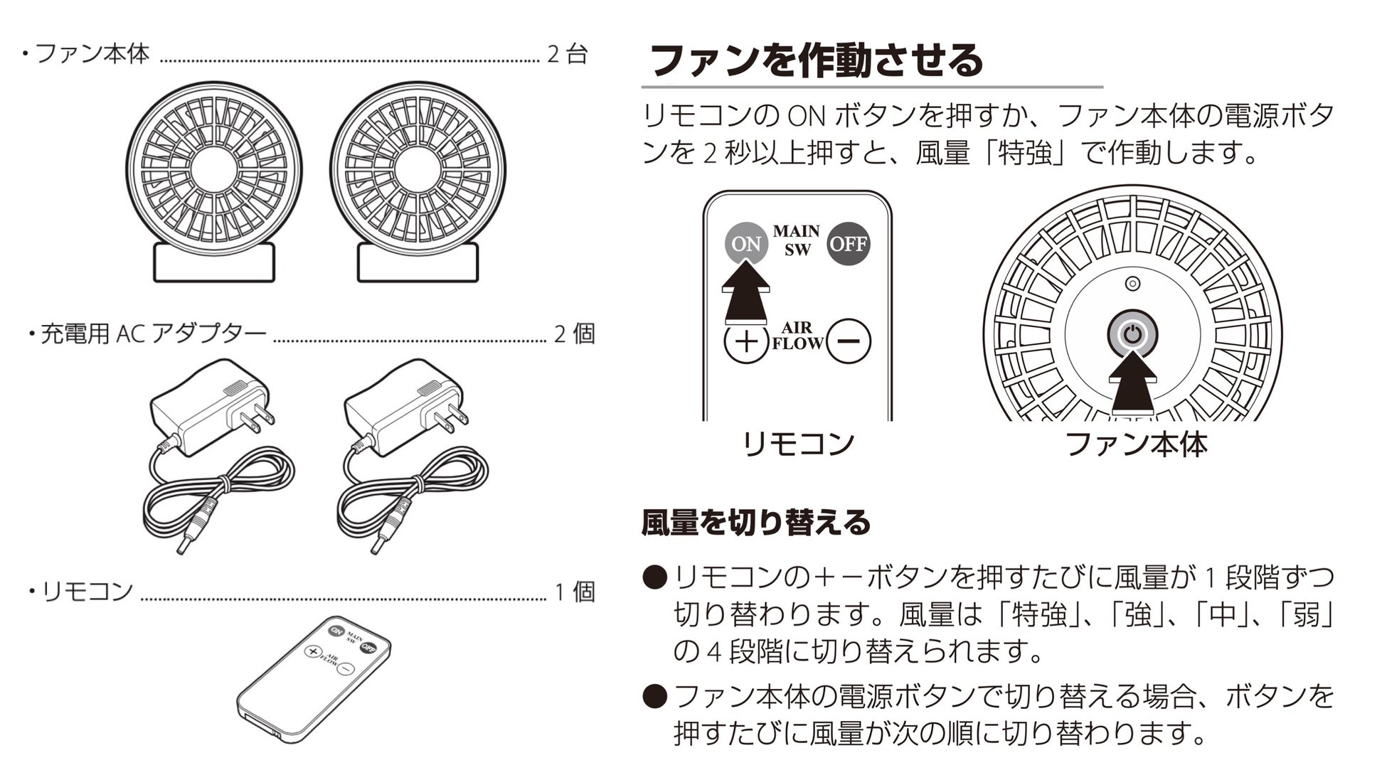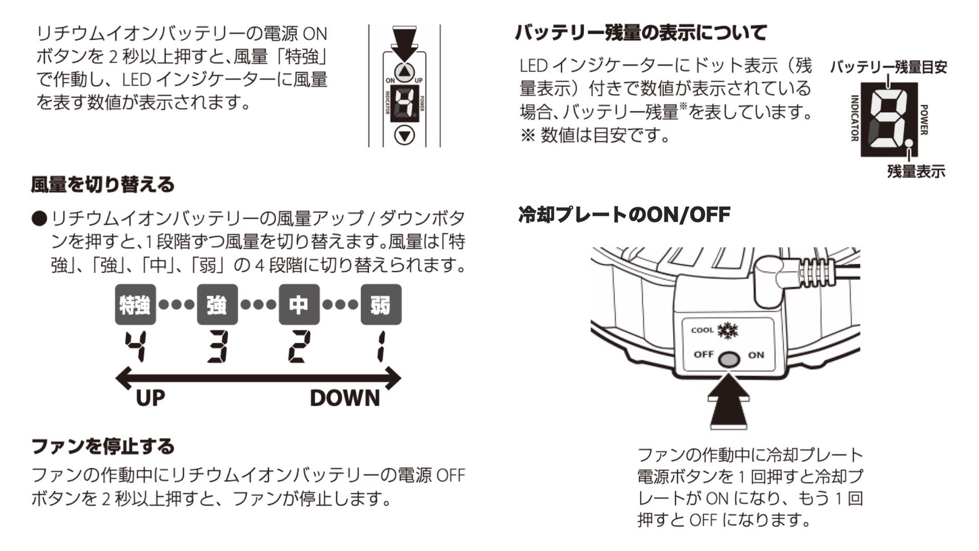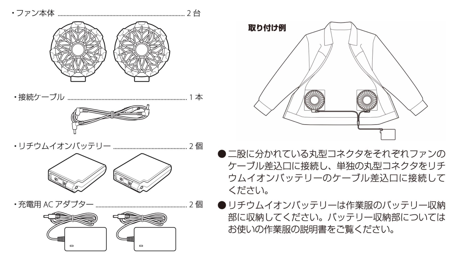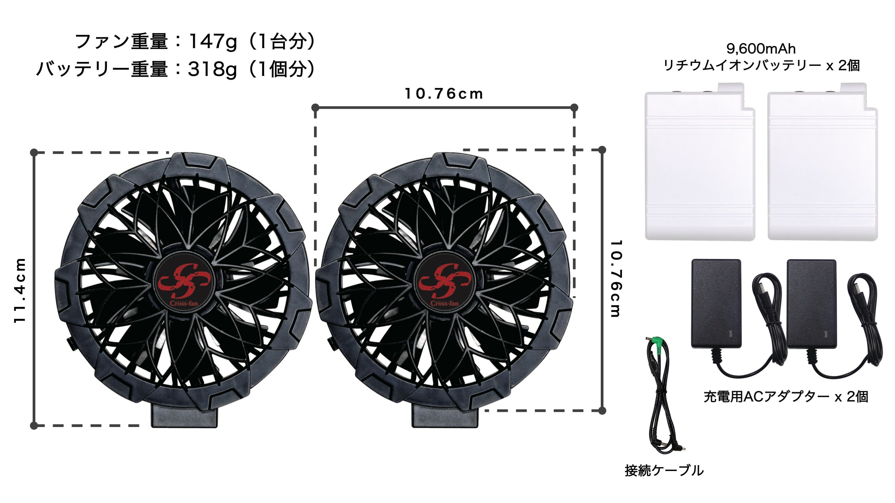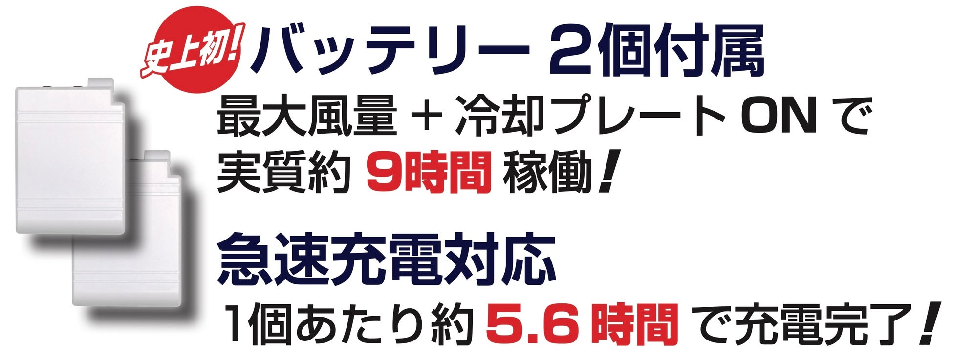 バッテリー単体では、「冷却プレートON+最大風量での駆動」の場合、約4.5時間しか持ちません。冷却プレート使用時でも長時間に渡り、最大風量をご使用いただける様に、「9,600mAh バッテリー x 2個」をデフォルトとして、製品に付属しております。