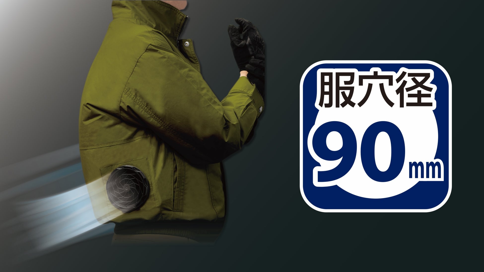 一般的なファン付ウェアは、穴径サイズが『90mm』で統一されいます。(一部サイズが違う服メーカーもございます)