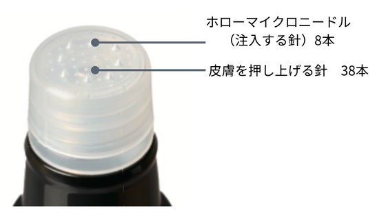 美容針で知られる化粧品は「塗る」タイプや、「貼る」タイプのものが一般的です。今回採用されたホローマイクロニードルは医療でも用いられているものです。38本の針で皮膚を押し上げ、8本の針で差し込み、わずか3秒で注入することができます。
