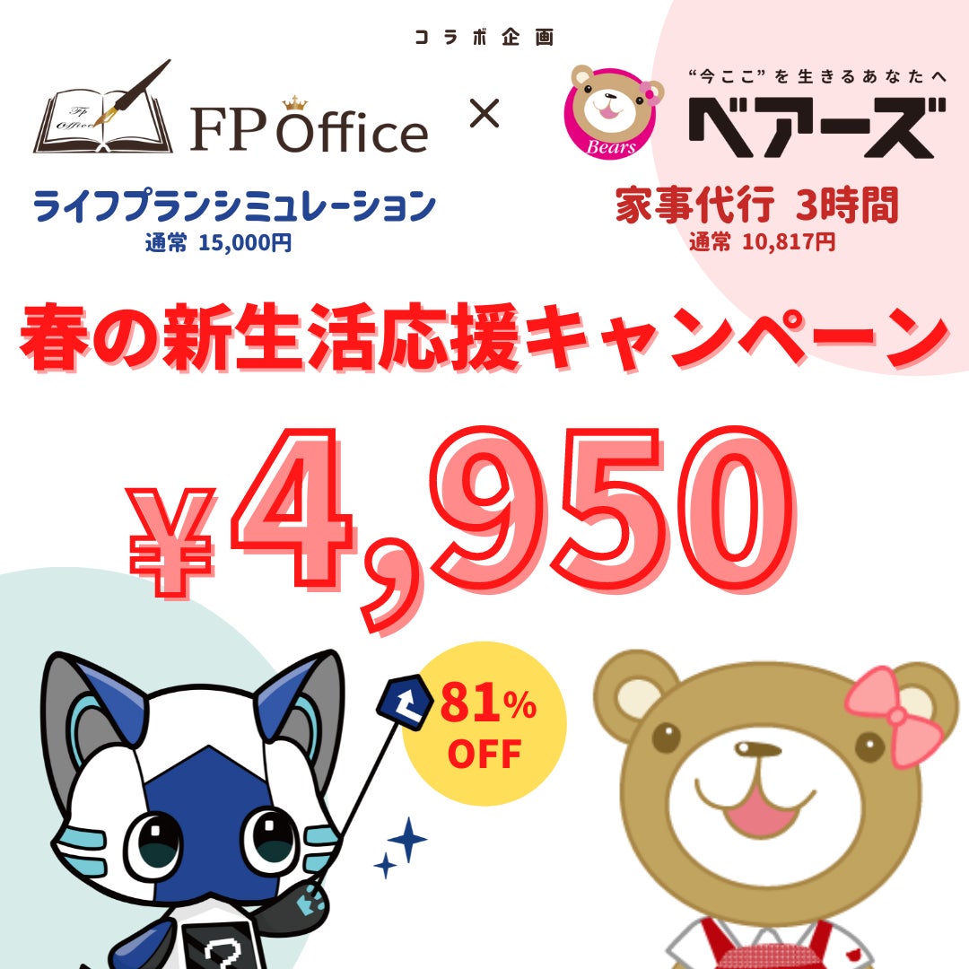 課題解決型FP事務所 『FP Office』を展開するライフコンサルティング株式会社(本社:東京都新宿区神楽坂/代表ファイナンシャルプランナー 中村達矢、以下FP Office)と株式会社ベアーズ(本社:中央区日本橋浜町/代表取締役社長:高橋健志 以下ベアーズ)は提携し、『FP Office×ベアーズ 新生活応援キャンペーン』として、相互のサービス利用を促進し、より豊かな暮らしを送るためのトータルサポートを拡充する取り組みをリリースいたしました。