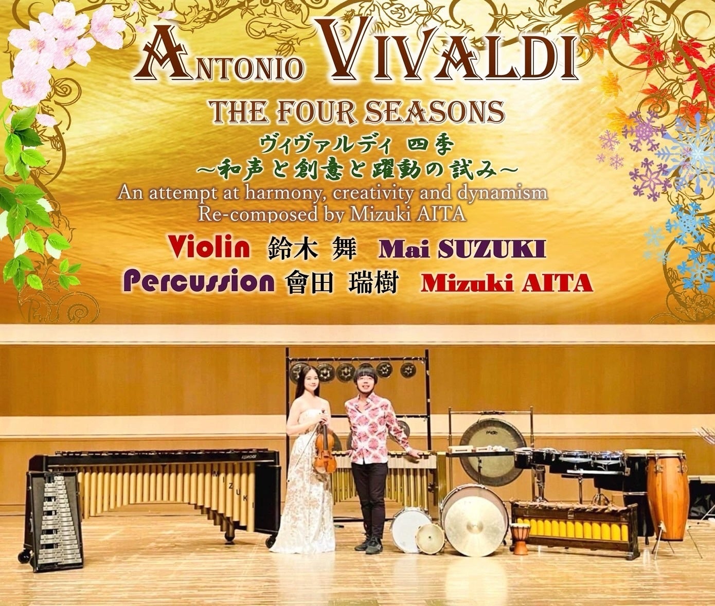 打楽器奏者、作曲家の會田瑞樹(b.1988)は、ヴァイオリニスト鈴木舞氏を迎え、ヴァイオリンと打楽器の二重奏による《ヴィヴァルディ 四季 "和声と創意と躍動の試み"》を発表。8月17日より各種サブスクリプション配信が開始され、Amazon music,Spotifyなどで聴取可能となりました。クラシック音楽や現代音楽の分野では斬新な試みとも言えるサブスクリプション配信に會田瑞樹が初の進出です。會田は今回の配信について、多くの方々により気軽に、自由に、音楽を楽しんでいただきたいという強い願いを込めています。さらに世界的名曲、アントニオ・ヴィヴァルディの四季を全く新たな切り口から演奏を試みる野心的な再作曲を手掛けました。ヴィブラフォンやマリンバはもとより、インドネシアガムラン楽器、アフリカンパーカッションなども取り入れ、民族色豊かな全く新しい「四季」がここに投影されました。