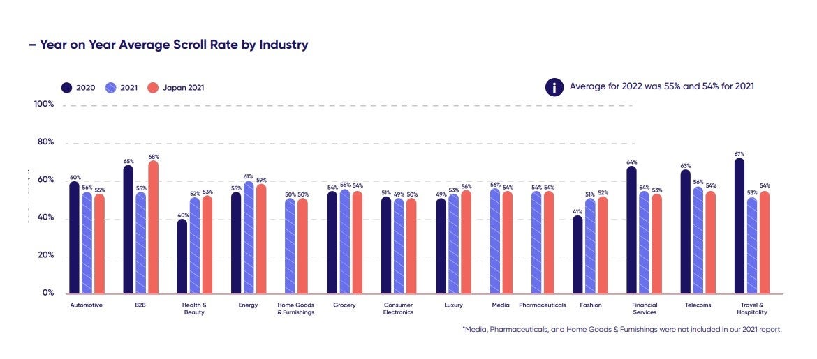 業種別の平均スクロール率は55%で、多くのお客様がWebページの途中までしか見ていないことがわかります。さらに、ウェブブラウジング活動においては、日本の顧客の半数が、ウェブサイトやモバイルサイトを1ページ見ただけで離脱していることがわかりました。