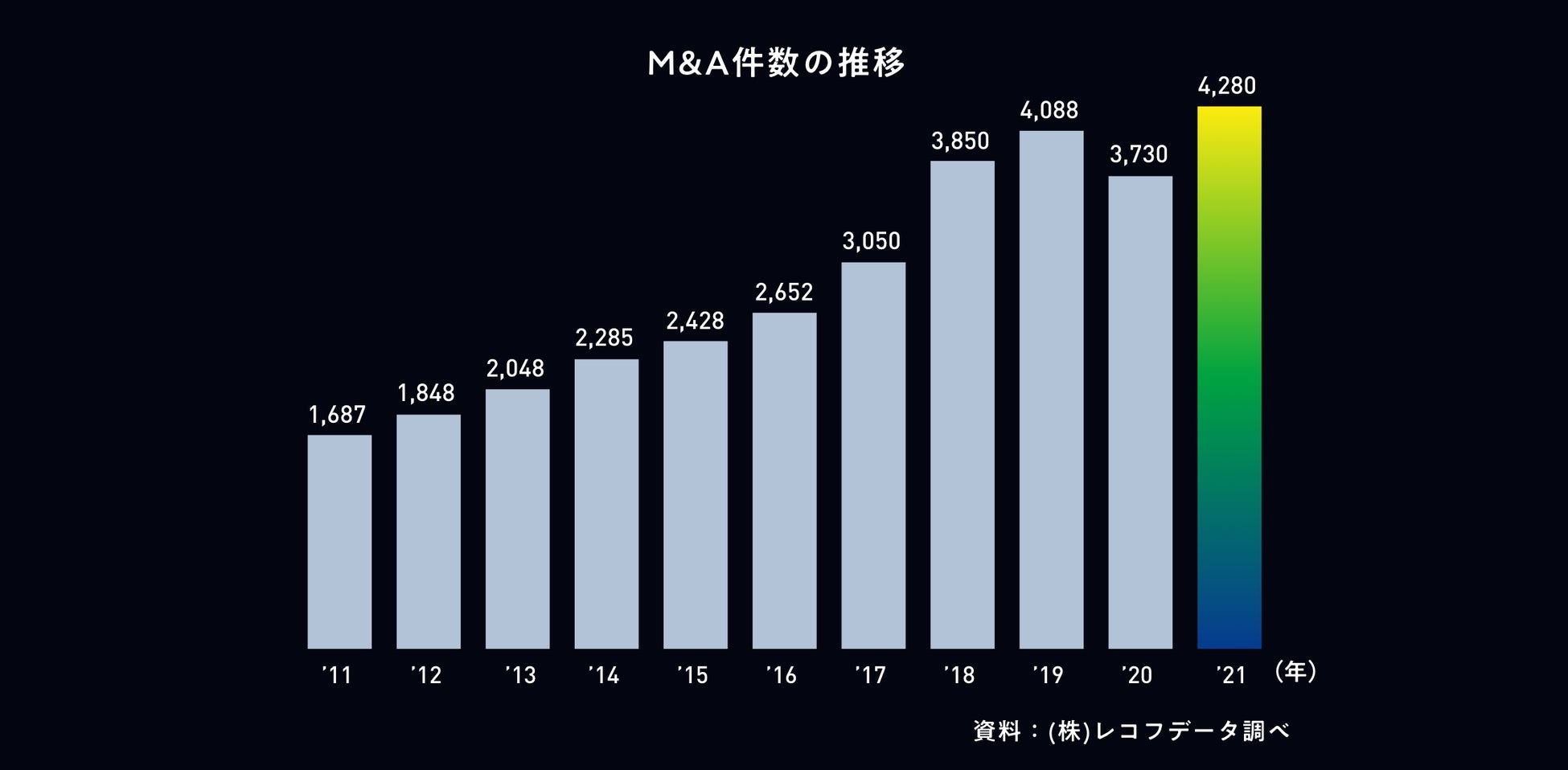 ⽇本国内の企業は99.7%が中⼩企業と⾔われています。後継者不在、⼈⼿不⾜、先⾏き不安等、中⼩企業を襲う様々な問題を理由にM&A件数は増え続けいます。