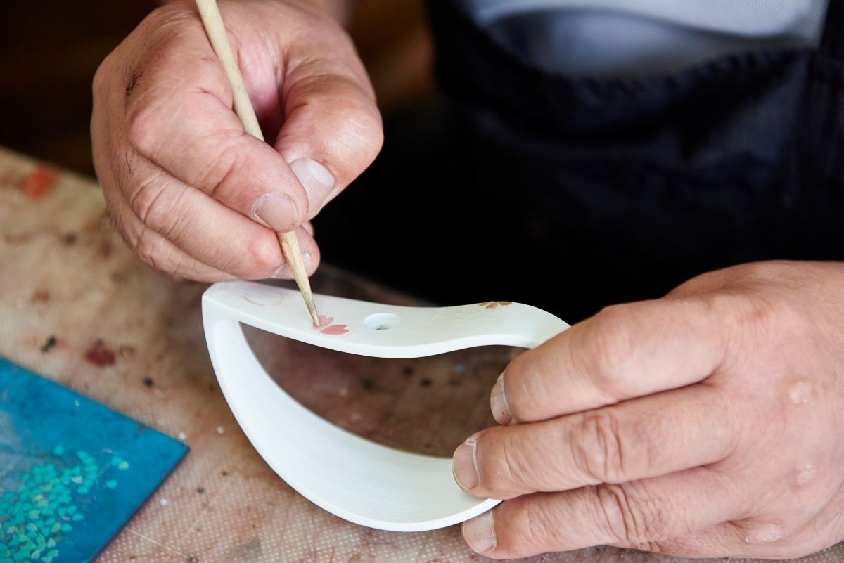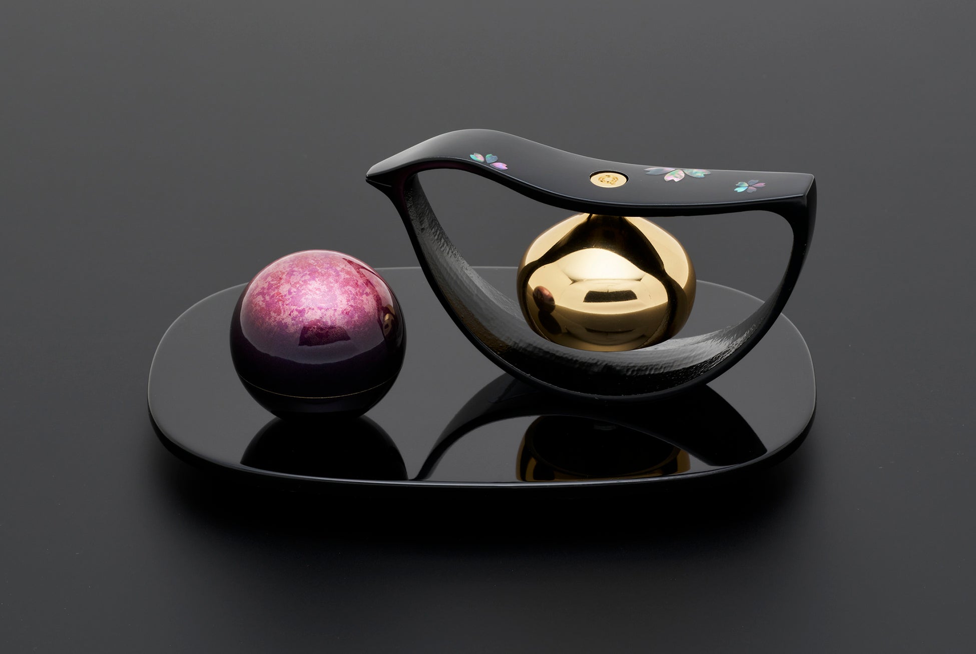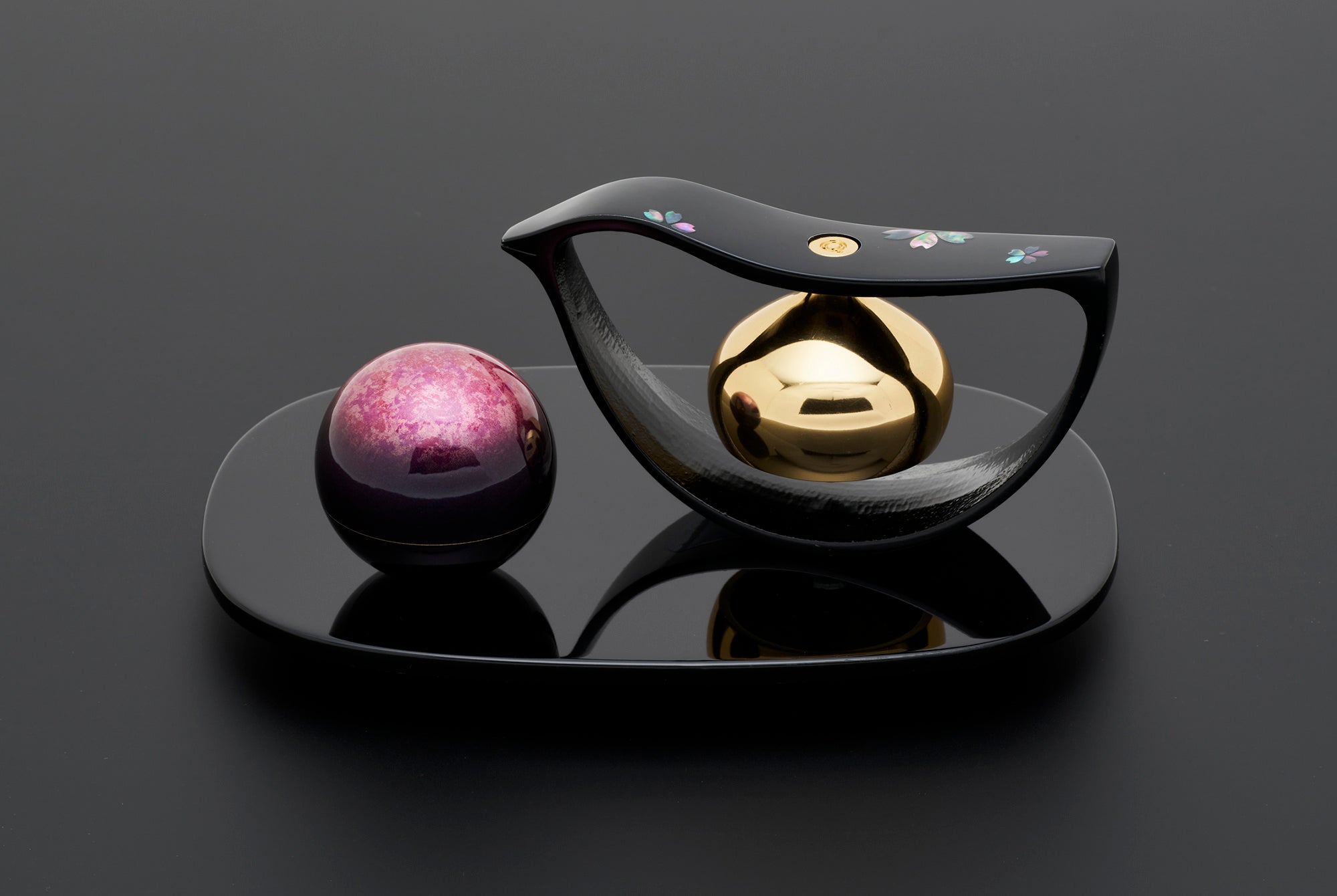 「かたみいれ」には丁寧に何層も色を重ねて焼き付け塗装を施しています。重ねた色層が光によって表情を変える深みのある手法で、雪洞で照らされた宵の桜を表現しました。おりんの小鳥のかたちをしたフレームには、宵の桜を青貝螺鈿で表現しています。