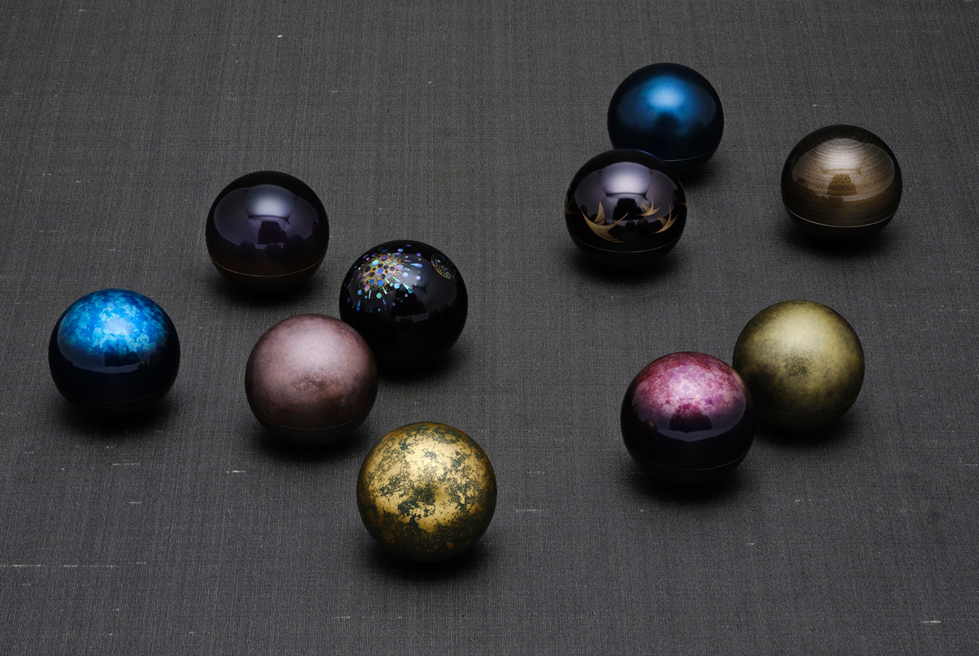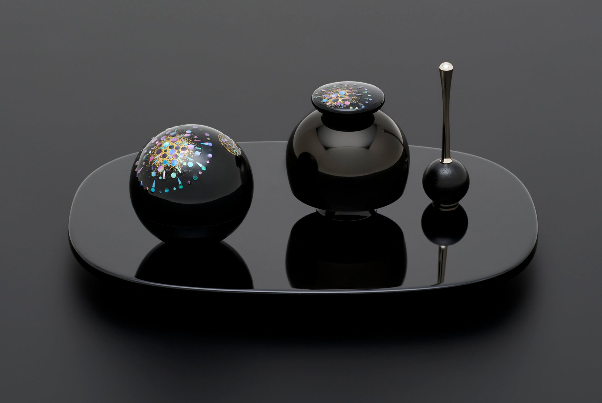 「かたみいれ」にも「おりん」にも天空を彩る花火を青貝螺鈿で表現しました。