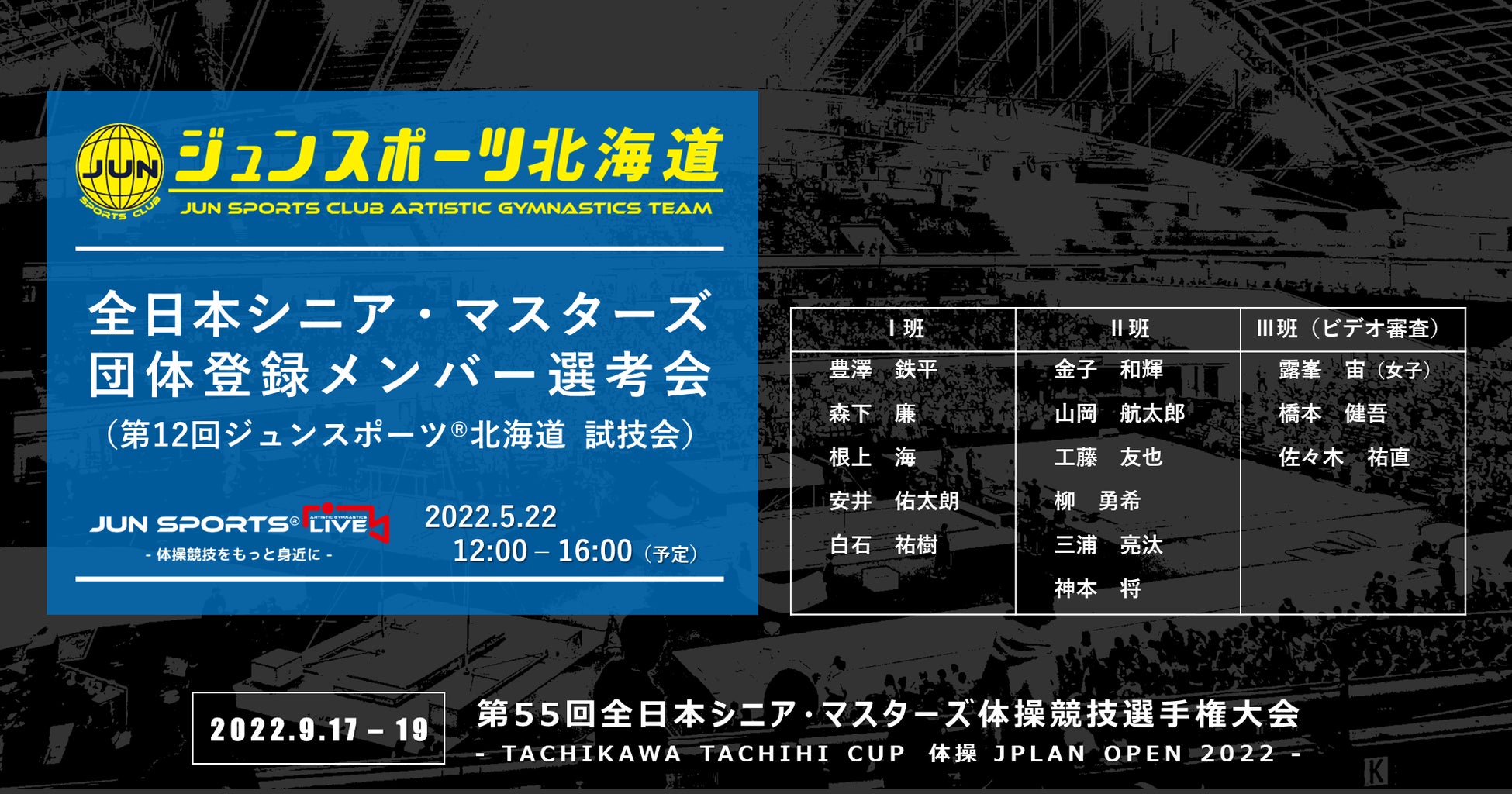 第55回全日本シニア・マスターズ体操競技選手権大会(9月17日~19日|アリーナ立川立飛)に出場するジュンスポーツ北海道は22日、札幌市内のジュンスポーツクラブ月寒で全日本シニア(1部)団体メンバー選考を兼ねた「第12回ジュンスポーツ®北海道 試技会」を実施する