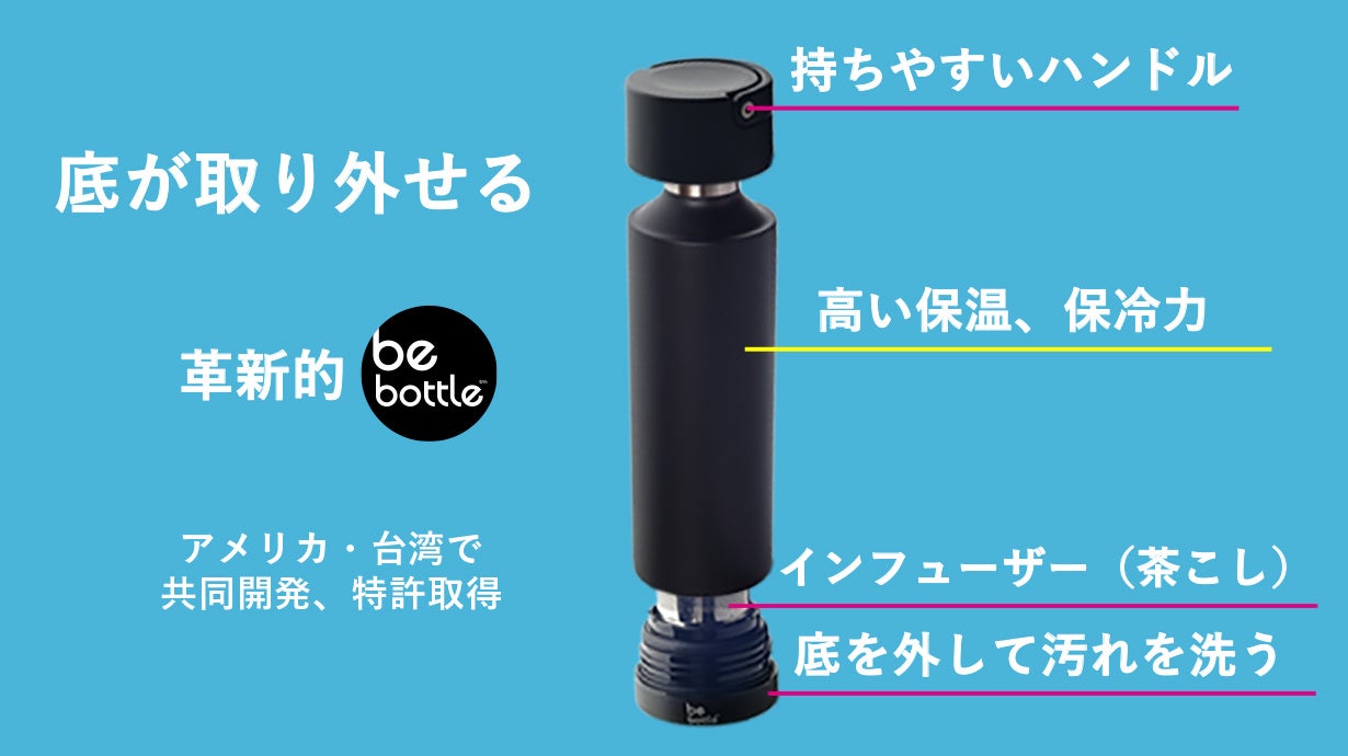 【底を外して洗う革新的ボトル!スッキリ洗浄で清潔。クリアーな水分補給を】茶こしつきで急須いらず-Be Bottle、2023年5月11日よりMakuakeにて先行販売開始