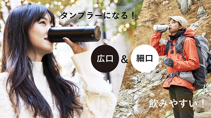 スタイリッシュなデザイン。家でも外でも保温保冷OK。氷も入る広口と細口。タンブラー使いOK
