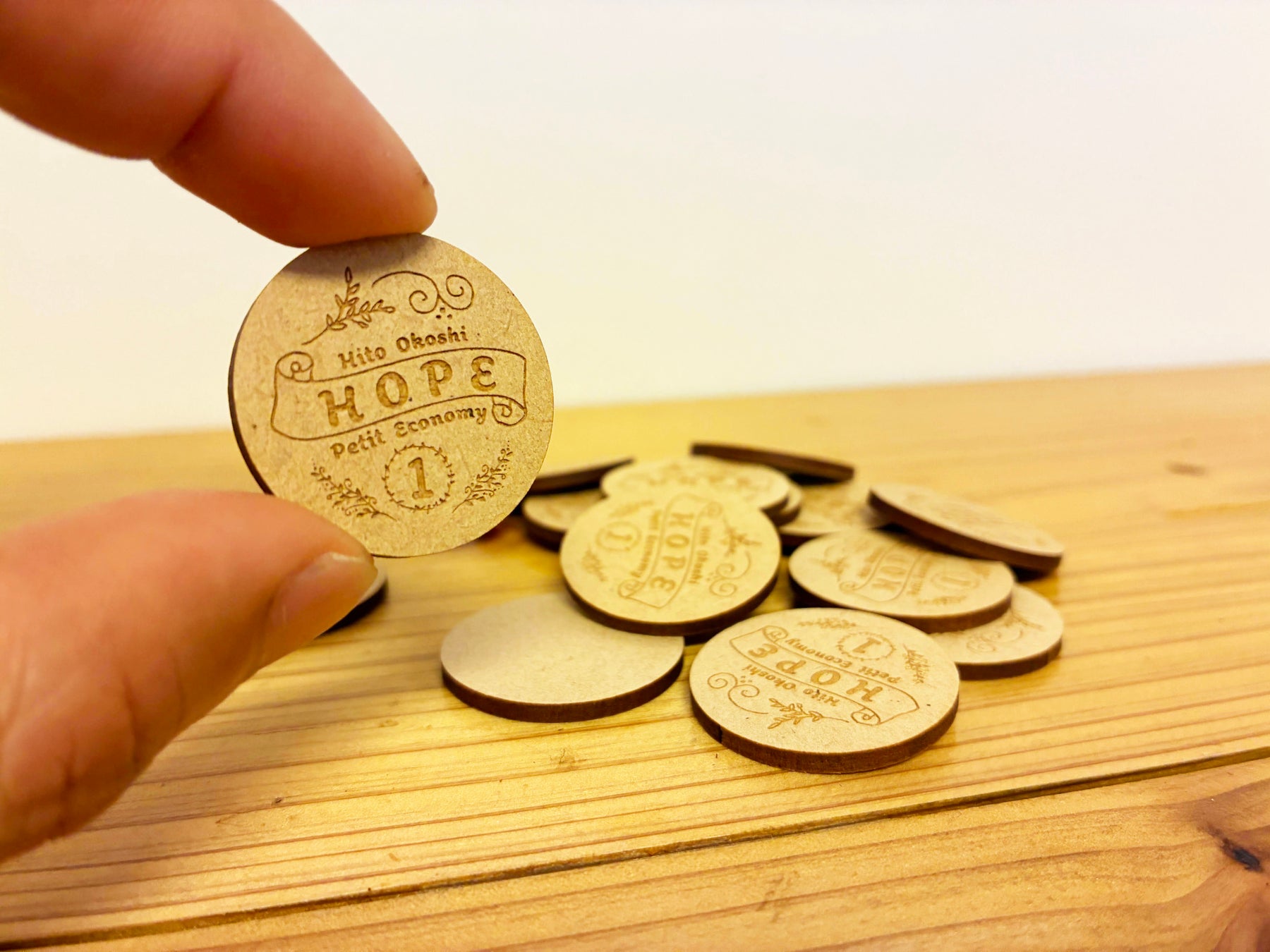 人おこしシェアハウスで流通する地域通貨「HOPE(Hito Okoshi Petit Economy=人おこしプチ・エコノミー)」は、直径3cmの木製コイン。