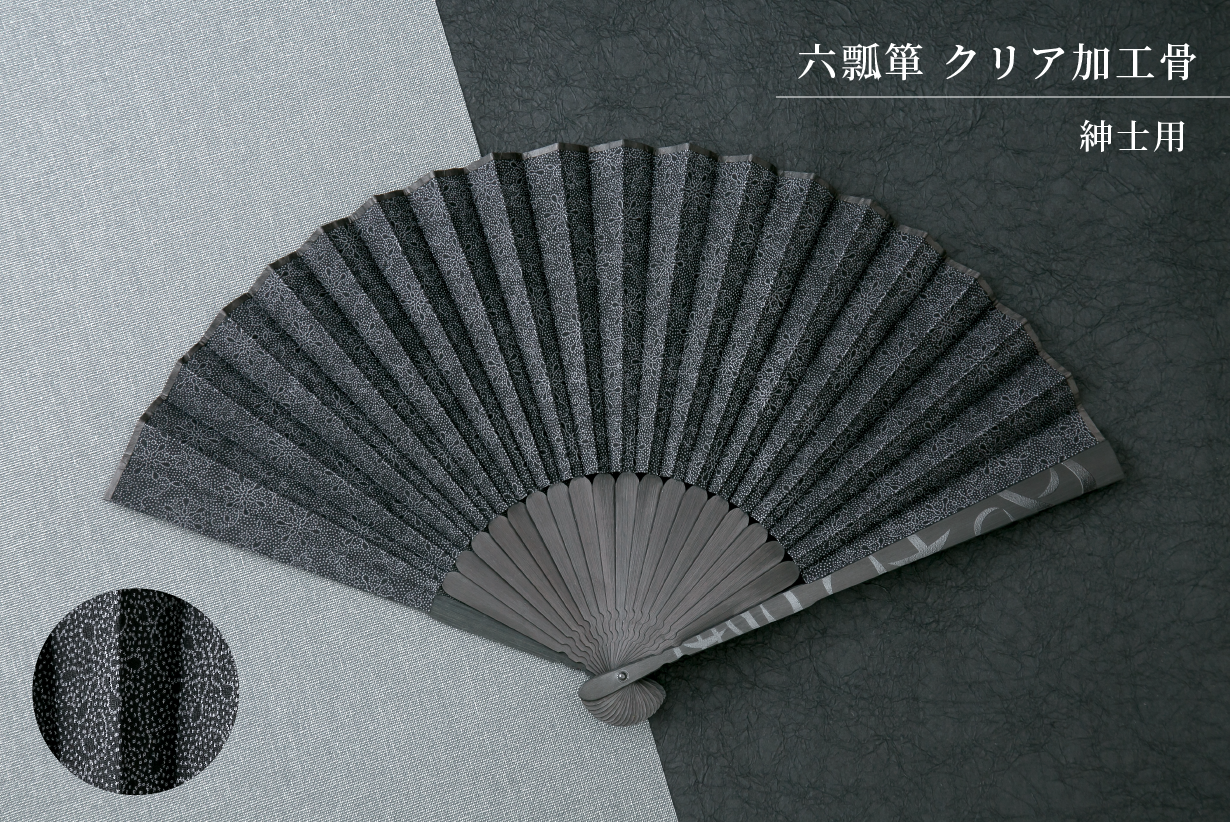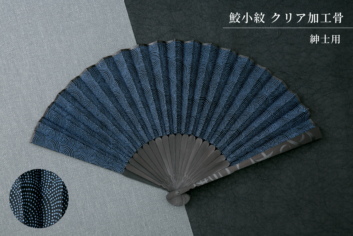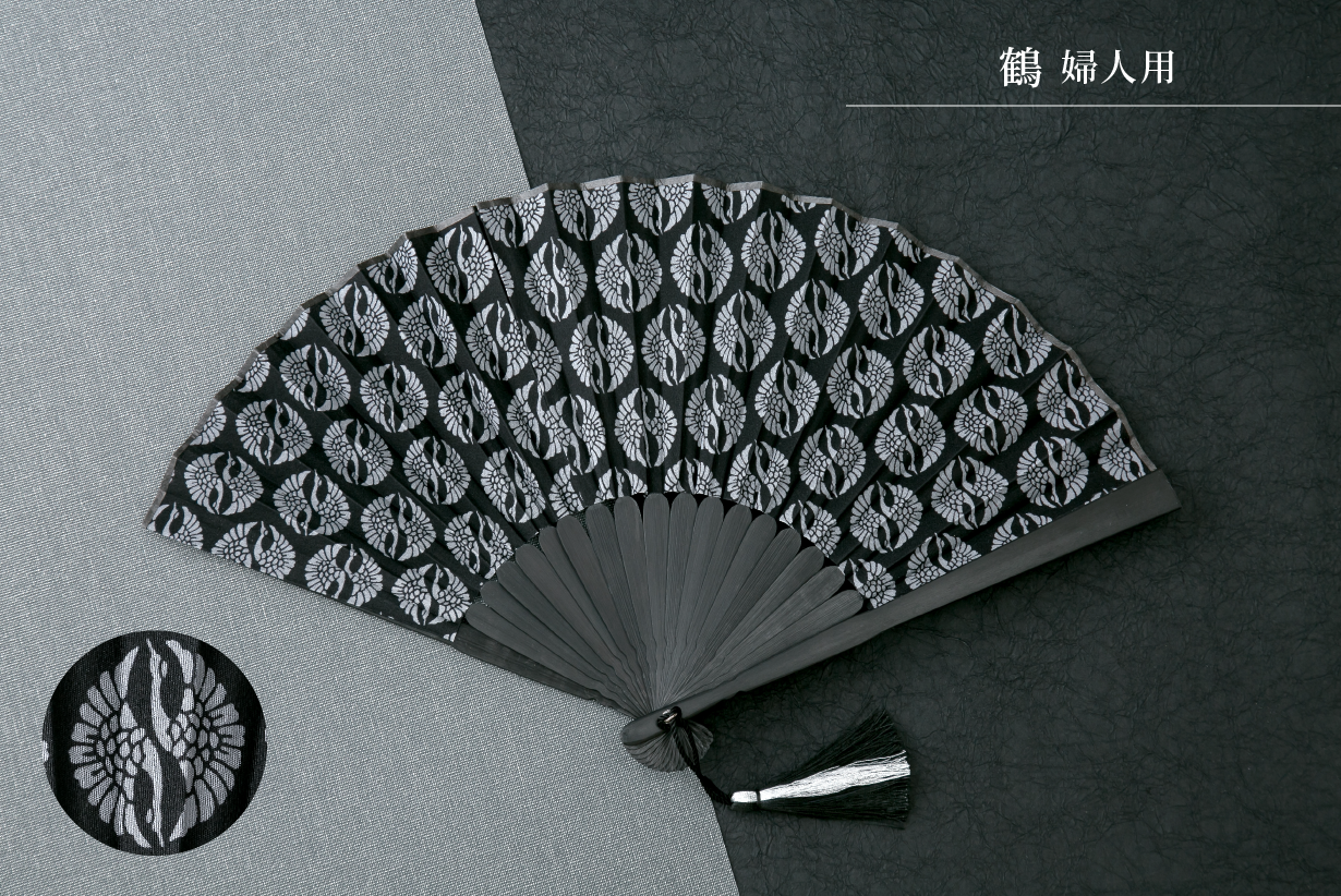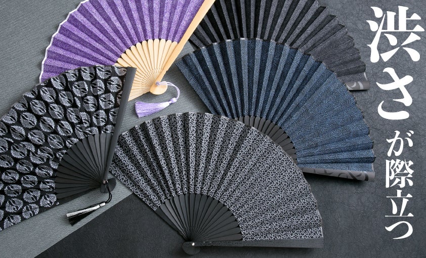 「職人の手で染め上げた着物生地を扇子に」黒を基調した、5種類のデザインをご用意しました。