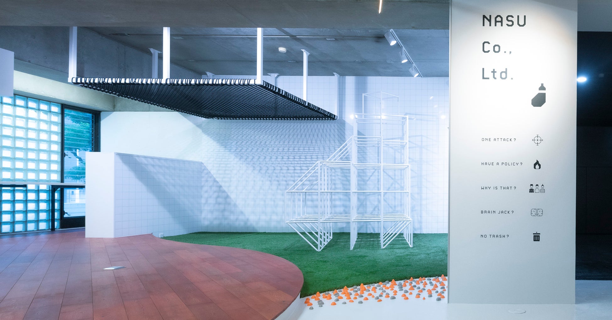 執務スペースの一角にはグリッドのある大きな壁面があります。ハンモックは概念的な装置ですが、こちらは実用的な装置です。「作ったデザインを俯瞰して見るための広い壁が欲しい」「NASUのロゴマークは、格子状のグリッドで構成されているので、四角いマグネットを貼ることで、ロゴマークを再現できるような壁が欲しい」と当初から前田さんより要望をいただいておりました。インクで線を引くことも考えましたが、それでは線をきれいに表現するのが難しいため、グリッドを印刷したシートの下に鋼板を仕込み、マグネットを貼ることができる仕様にしています。