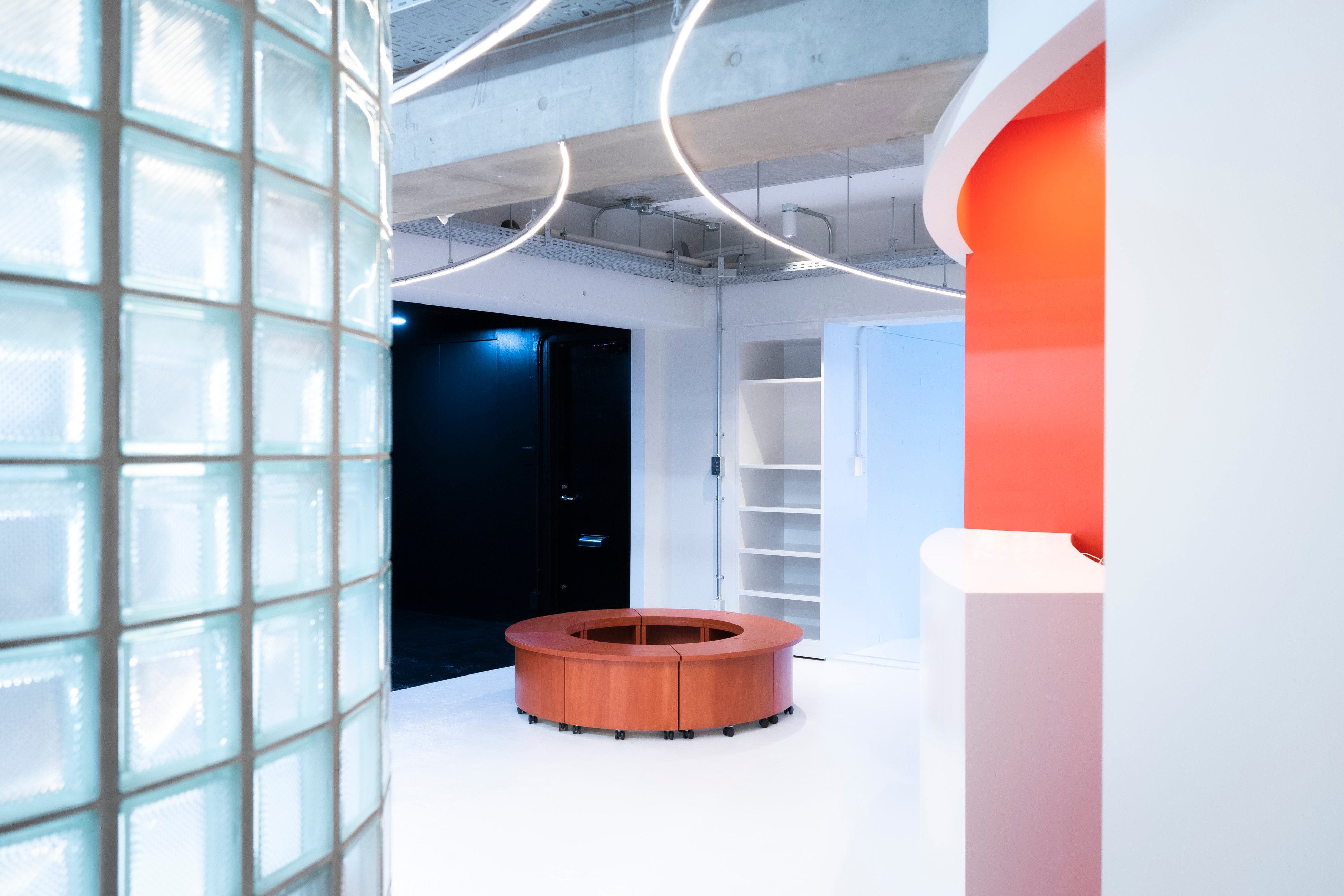 執務スペースは白を基調とした空間。ギャラリーはそれとは別の空間であることを示すため床、壁、天井ともに黒一色でデザインしました。円形のベンチは8つに分割でき、トークイベント時などは8つの椅子として用いることも可能となっています。「ギャラリーのあるオフィスにしたい」「収納スペースがたくさんほしい」の両方のご要望を叶えるため、両サイドの壁と正面の壁に収納スペースを設けています。