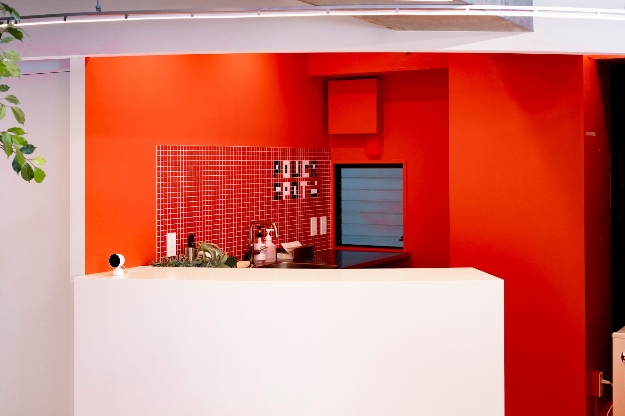給湯室は執務スペースとギャラリーの間にあります。また、NASUさんはコミュニティやイベントを開催されることが多く、人の出入りが多いので給湯室にはカウンターの併設をご提案しました。NASUで働くみなさんや来社される方々でコミュニケーションが生まれることを期待しています。壁面の「POWER SPOT」という文字は前田さんにグリッドでデザインしていただき、モザイクタイルで施工しています。