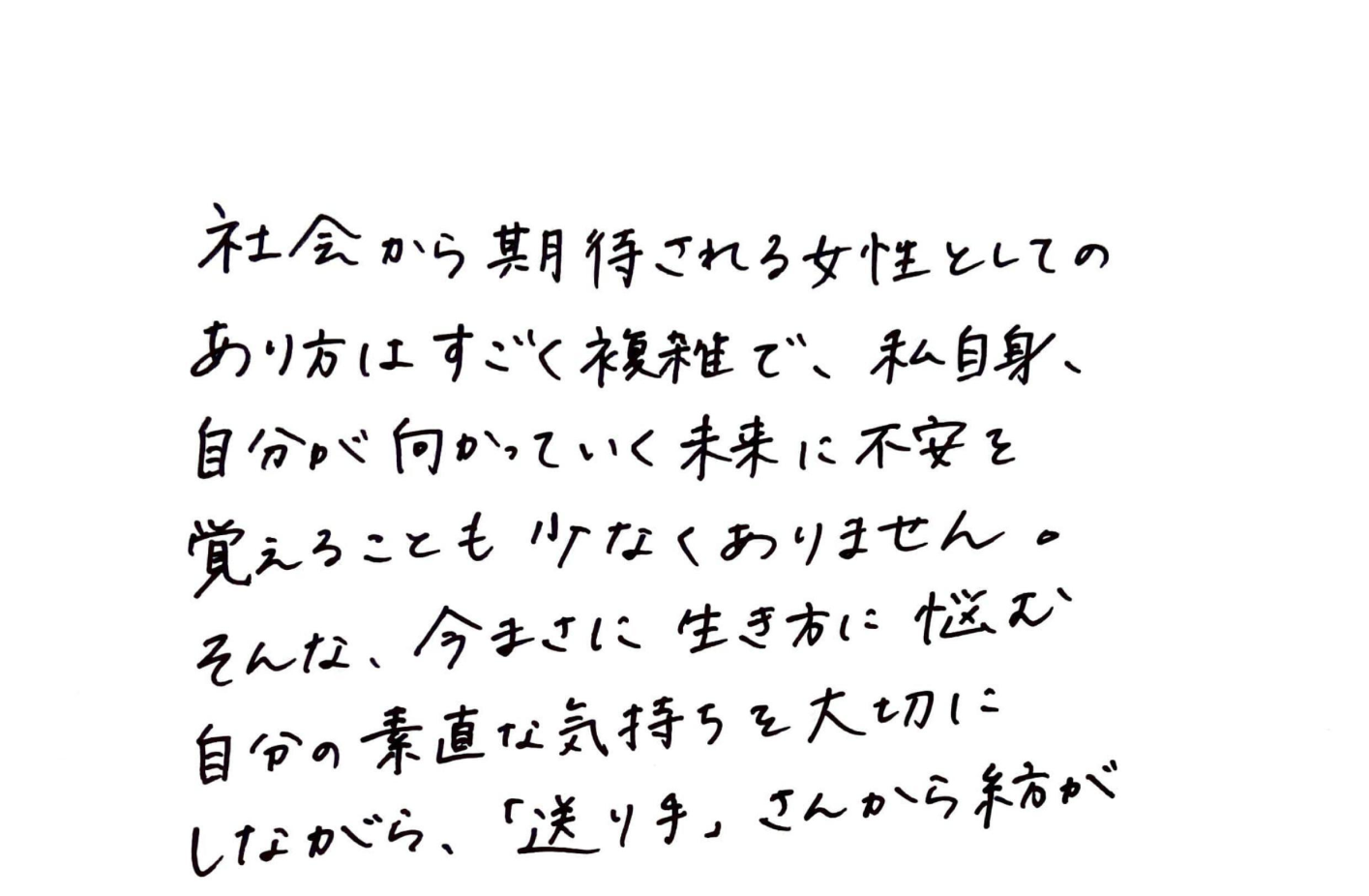 社会から期待される女性としてのあり方はすごく複雑で、 私自身、自分が向かっていく未来に不安を覚えることも少なくありません。そんな、今まさに生き方に悩む自分の素直な気持ちを大切にしながら、「送り手」さんから紡がれる言葉を通して、みなさんと一緒に「わたしらしい」道を探していきたいと思います。何かに挑戦したい時、自分を見つめ直したい時、あなたにそっと寄り添える番組であれるよう、心を込めてインタビューをお届けしてまいります。