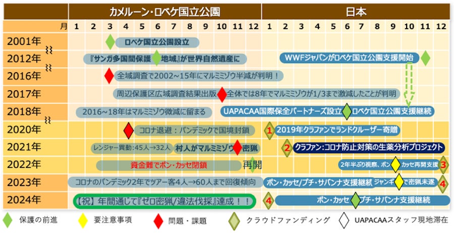 カメルーン政府森林省ロベケ国立公園当局およびWWF (世界自然保護基金)カメルーンと連携し、マルミミゾウを初め野生生物の保護と、現地コミュニティの持続可能な開発の両立を推進しています。
