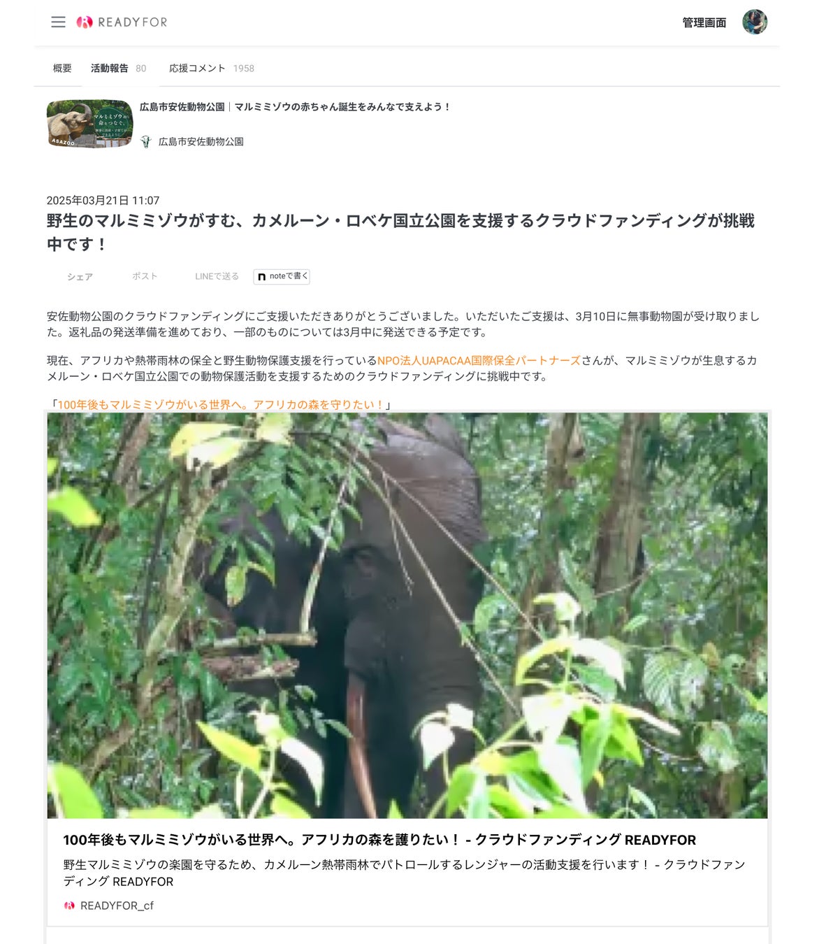「これまでの活動報告で、マルミミゾウが絶滅の危機にある動物であることを紹介してきました。UAPACAA国際保全パートナーズさんのクラウドファンディングのページでは、より詳しい現地での状況も紹介されています。日本から、マルミミゾウの保全活動に貢献できるチャンスでもありますので、是非HPをご覧ください。」(記事より)