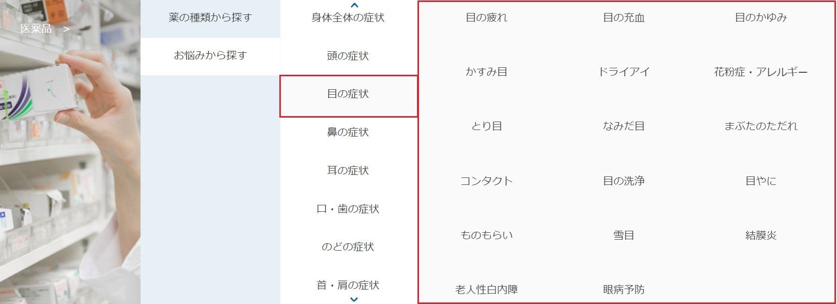 例えば目に関する商品を探したい場合、目に関するさまざまな症状の中から、お悩みの症状に合わせて検索することで、目的の商品に素早くたどり着くことができます。