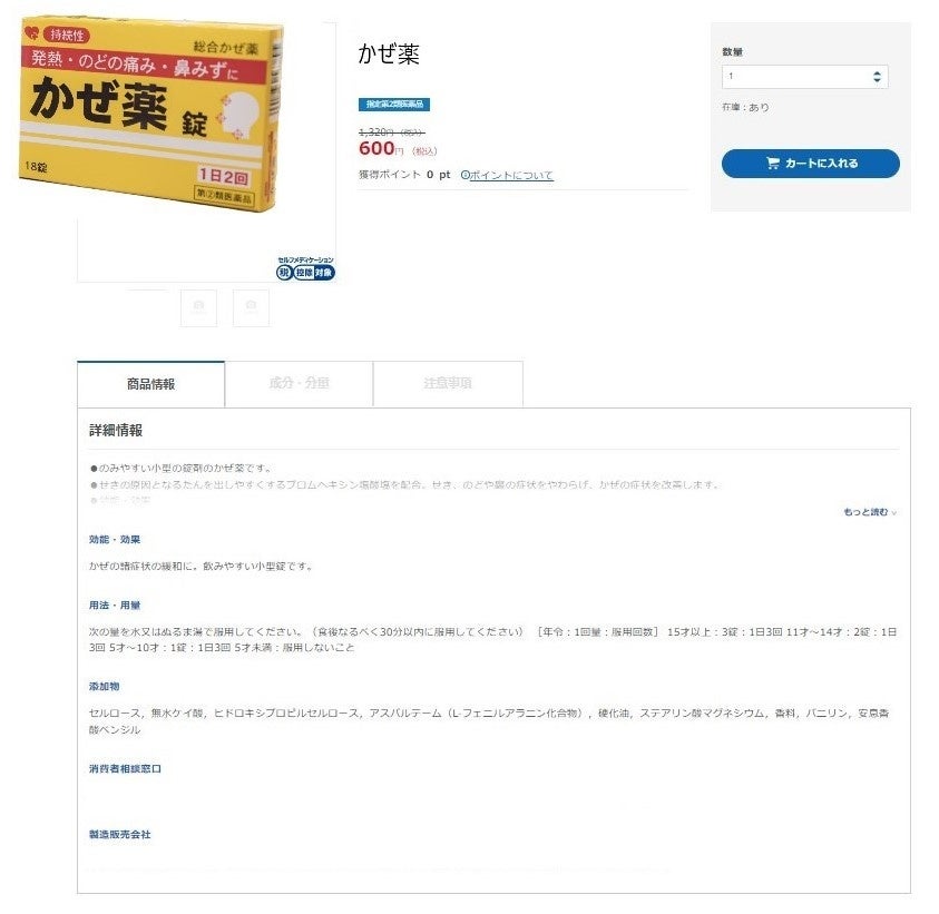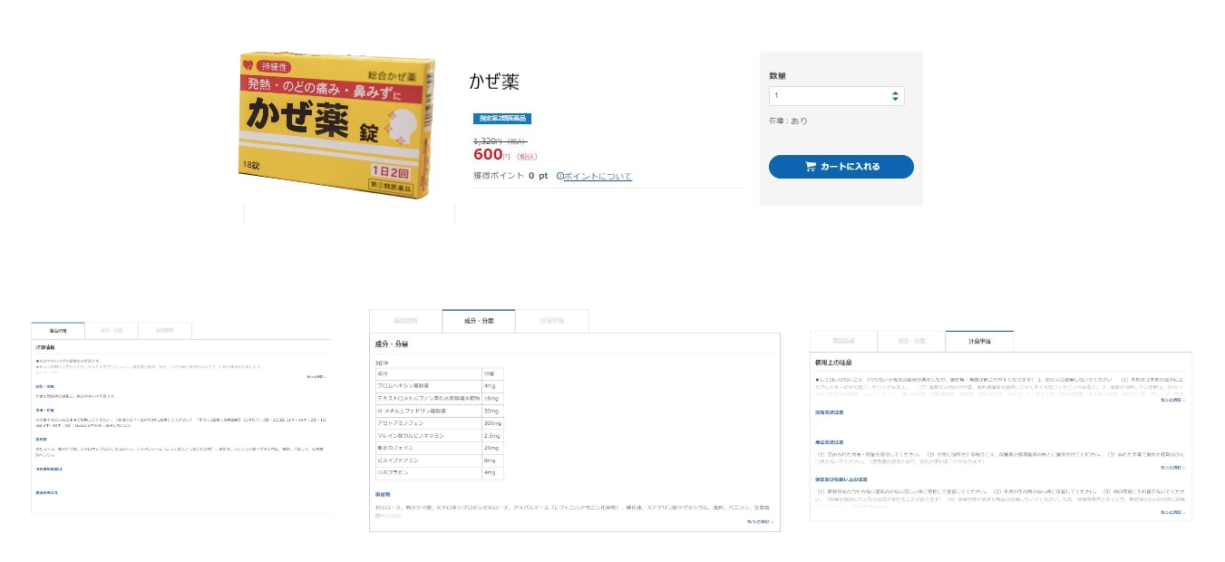 商品ページごとに成分や分量、注意事項の詳細、添加物など商品の詳細が確認できます。
