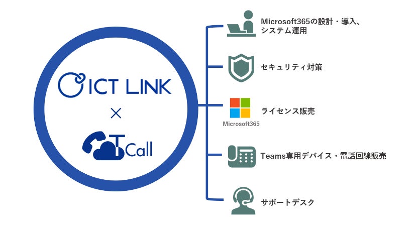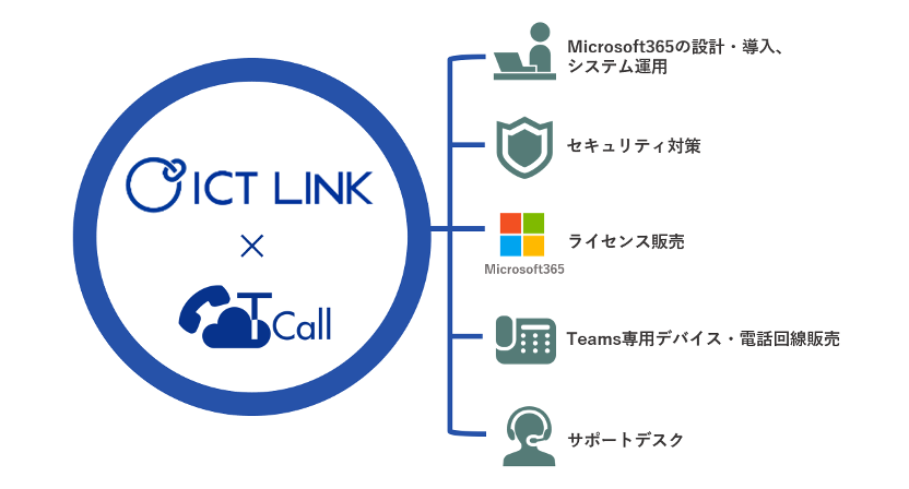 Microsoft 365の設計、導入、セキュリティ対策、電話回線や電話機、システムの運用、ライセンス販売までワンストップで出来るのはICTLINK×「TCall」のみ。(※リリース日時点の情報です)