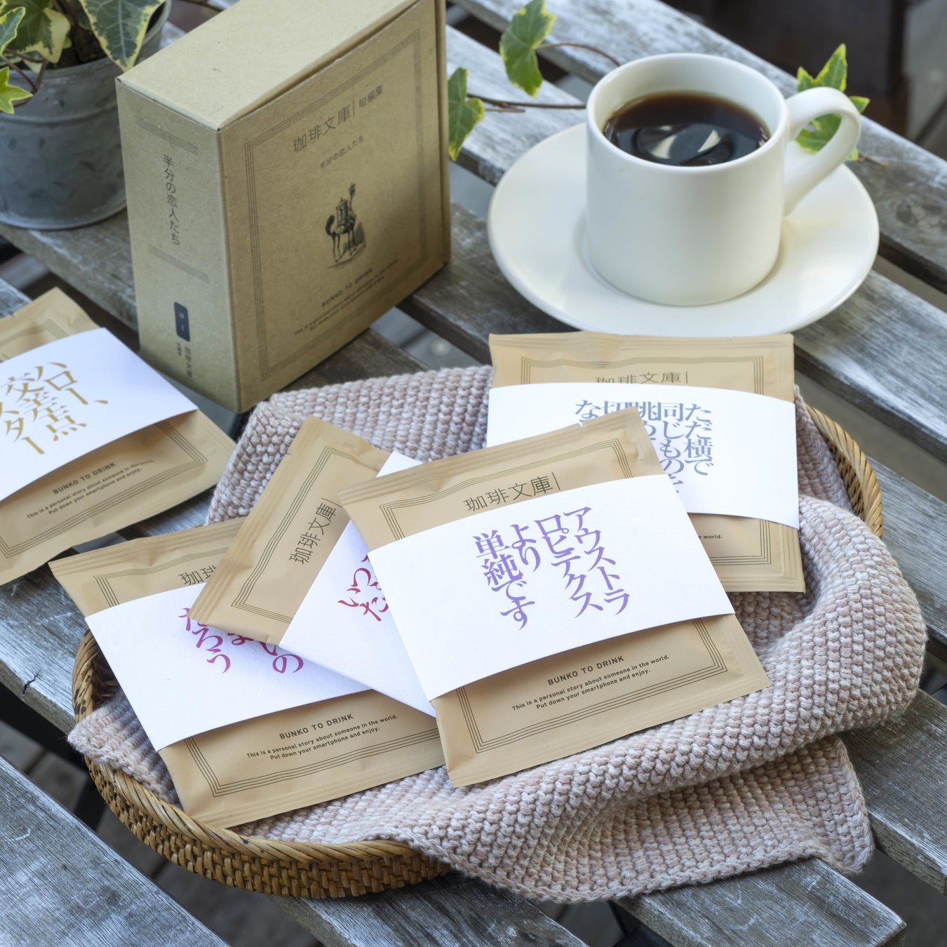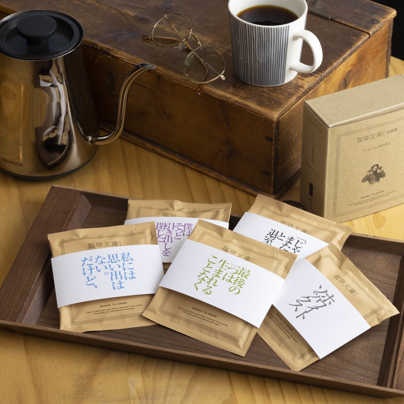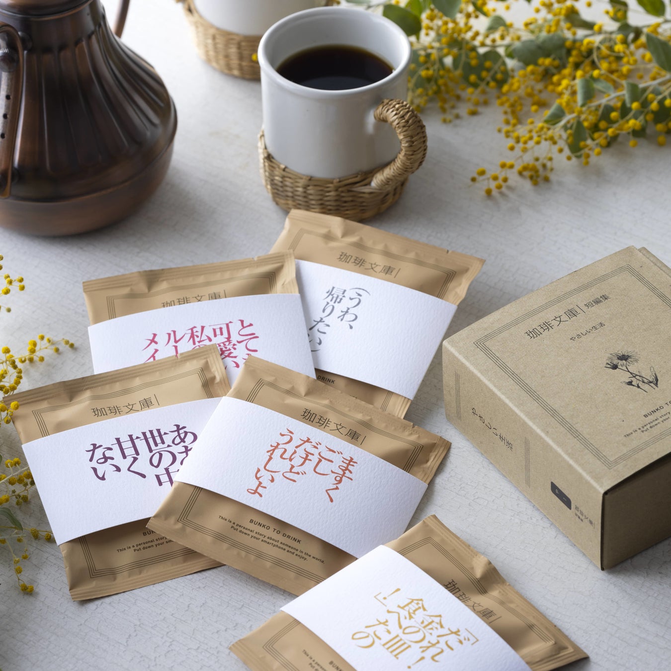 全30作品から5作品ずつ集録した6つの短編集。コーヒーのフレーバーはいずれも5種類ずつ封入しています。ドリップバッグコーヒーのパッケージには、各作品の一節を記した本の帯を付け、1冊の短編集に見立てたデザインのボックスに詰め合わせました。