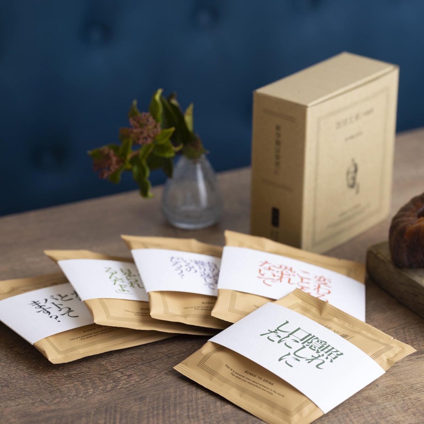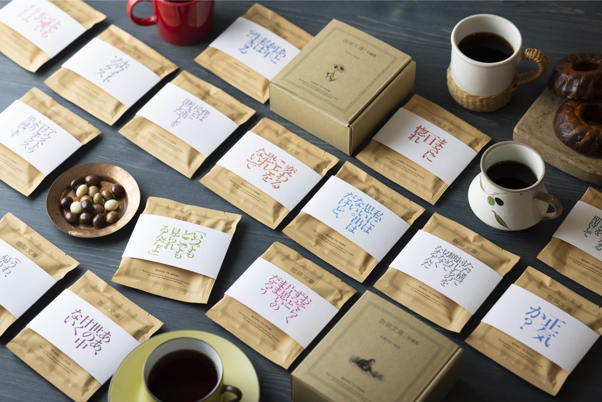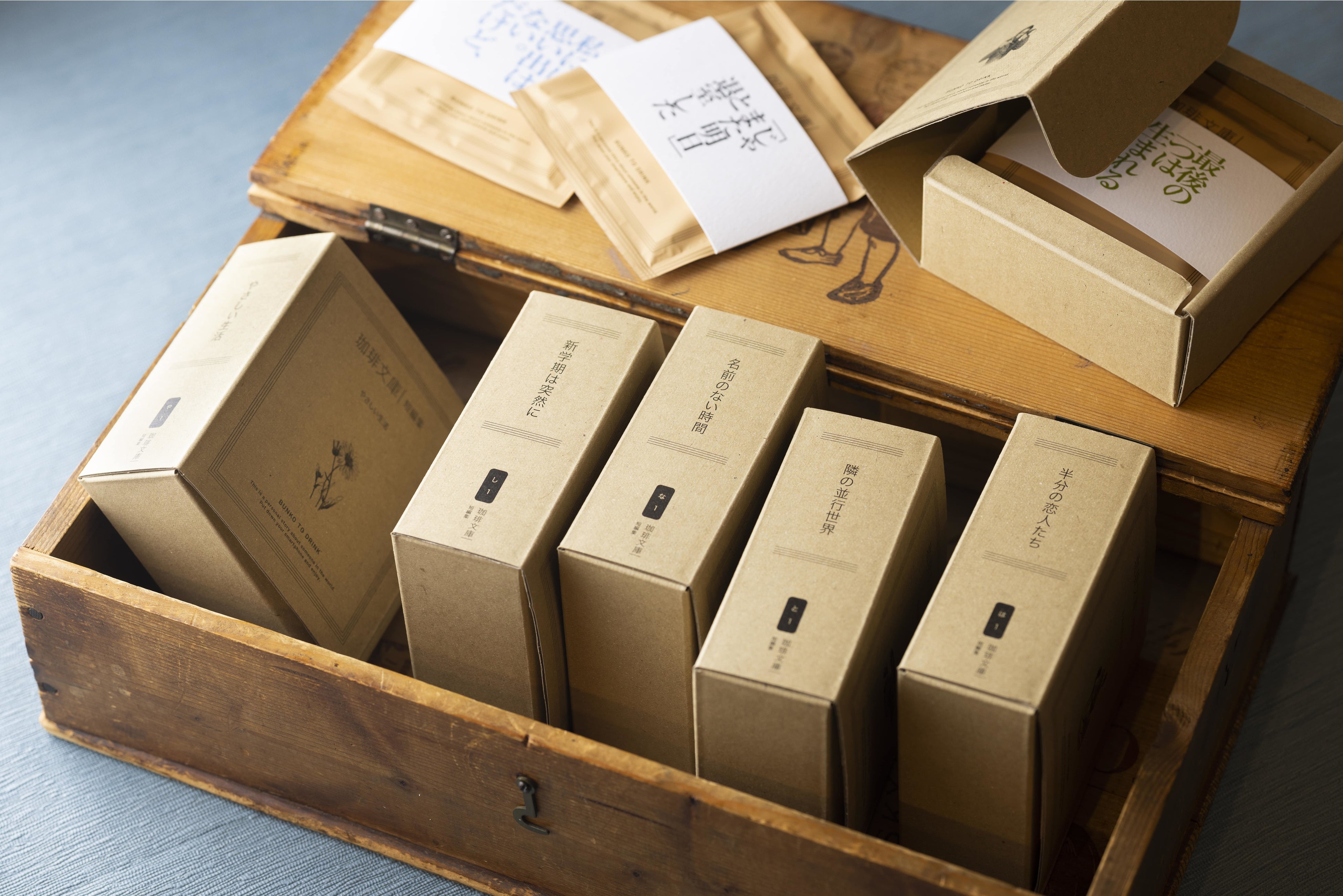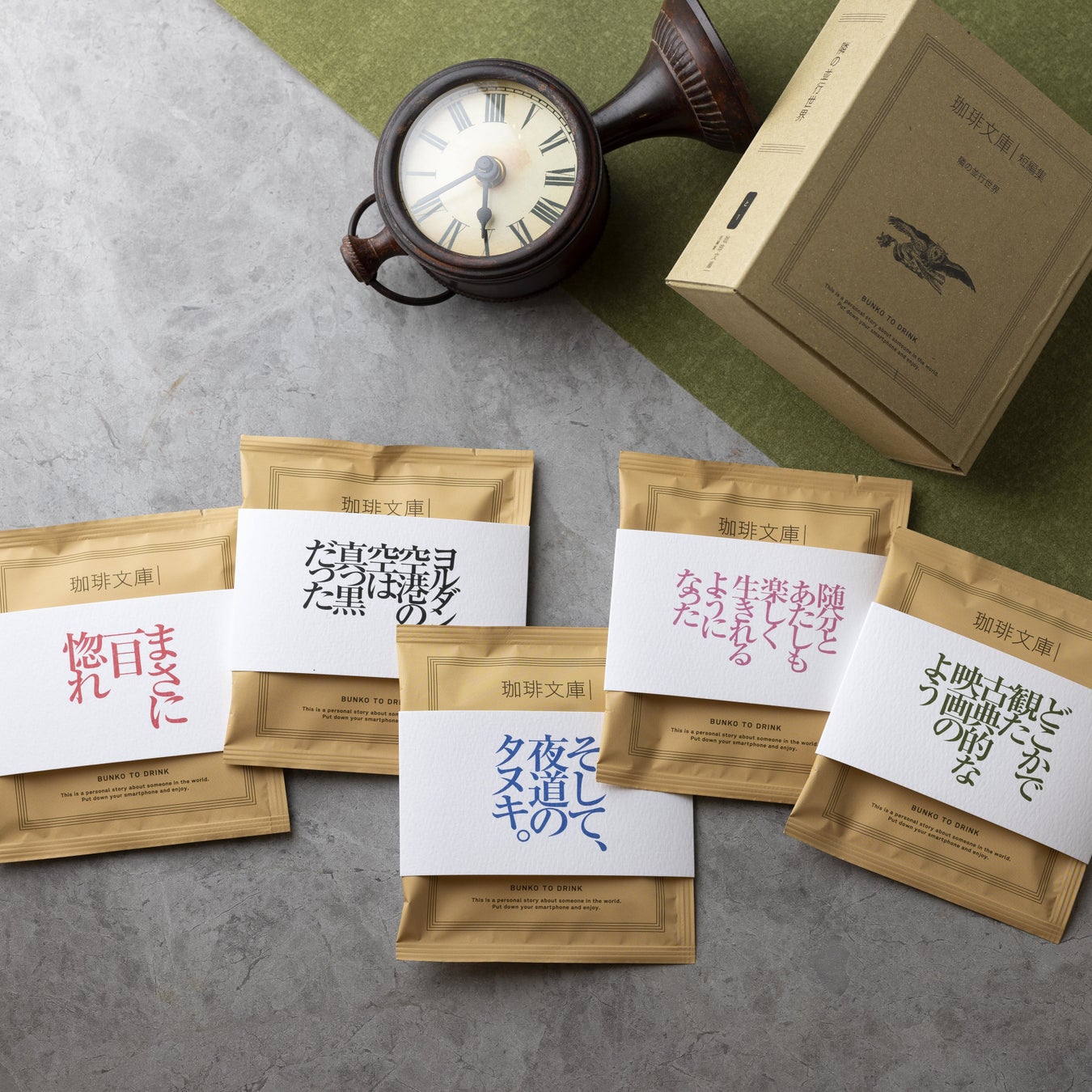 全30作品から5作品ずつ集録した6つの短編集。コーヒーのフレーバーはいずれも5種類ずつ封入しています。ドリップバッグコーヒーのパッケージには、各作品の一節を記した本の帯を付け、1冊の短編集に見立てたデザインのボックスに詰め合わせました。