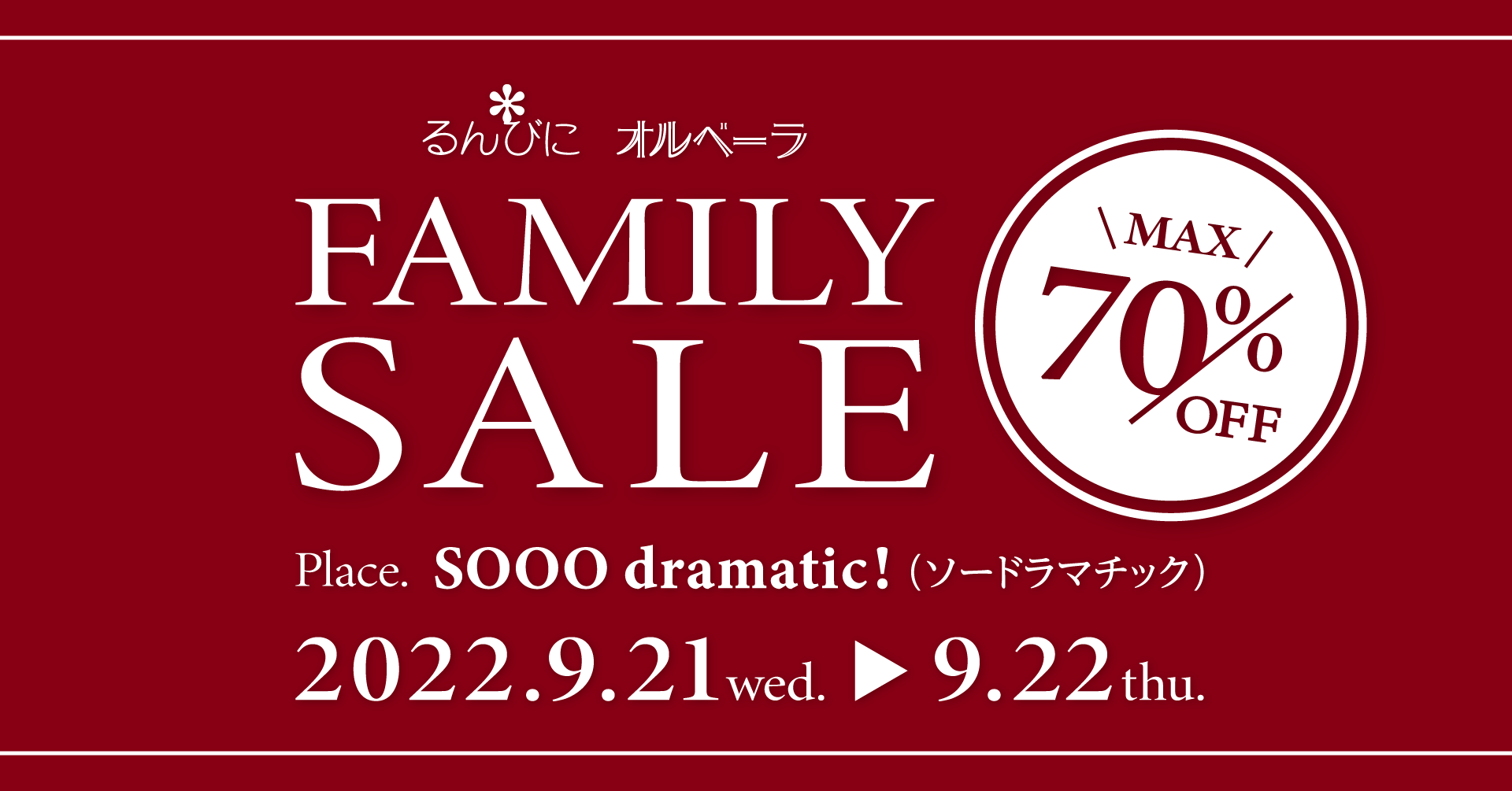 株式会社東京白ゆり会 (本社:東京都世田谷区、代表取締役:廣川直己)が展開するシルバーミセス向け婦人服ブランド「るんびに・オルベーラ 」は、2022年9月21日(水)22日(木)に東京都台東区入谷にて2日間限定のファミリーセールを開催します。