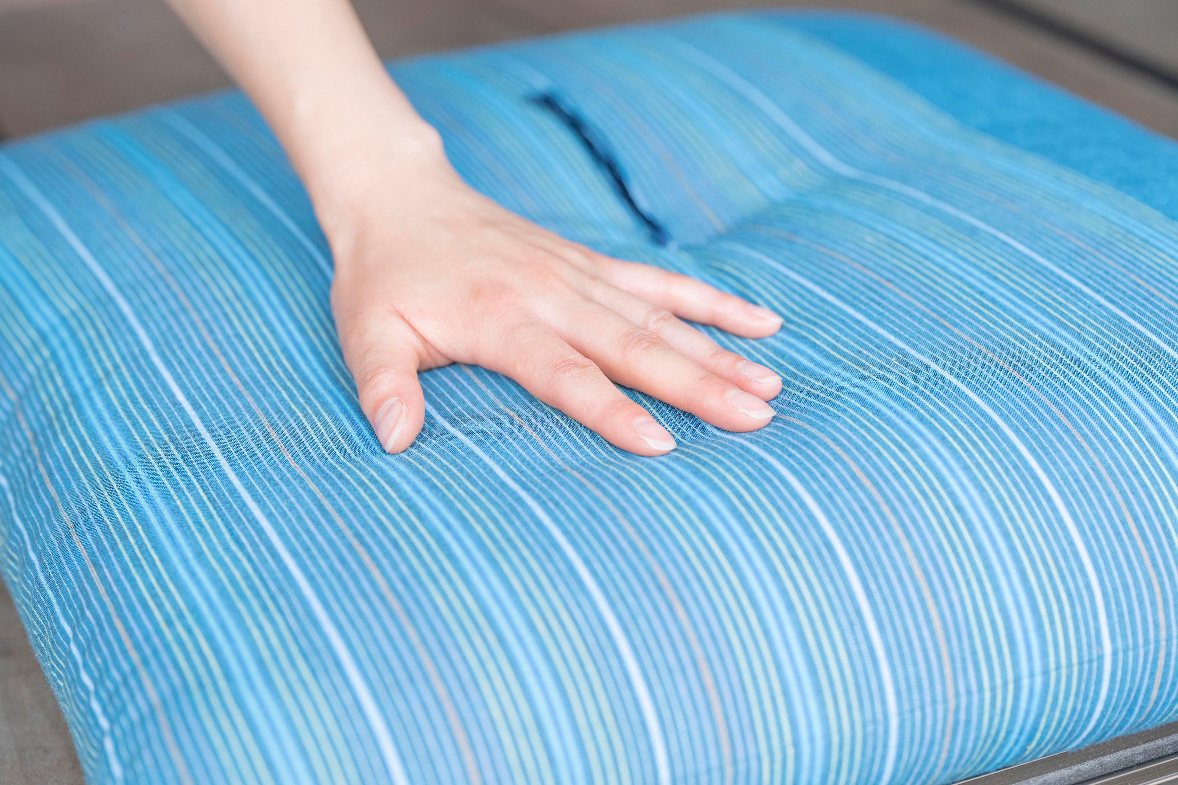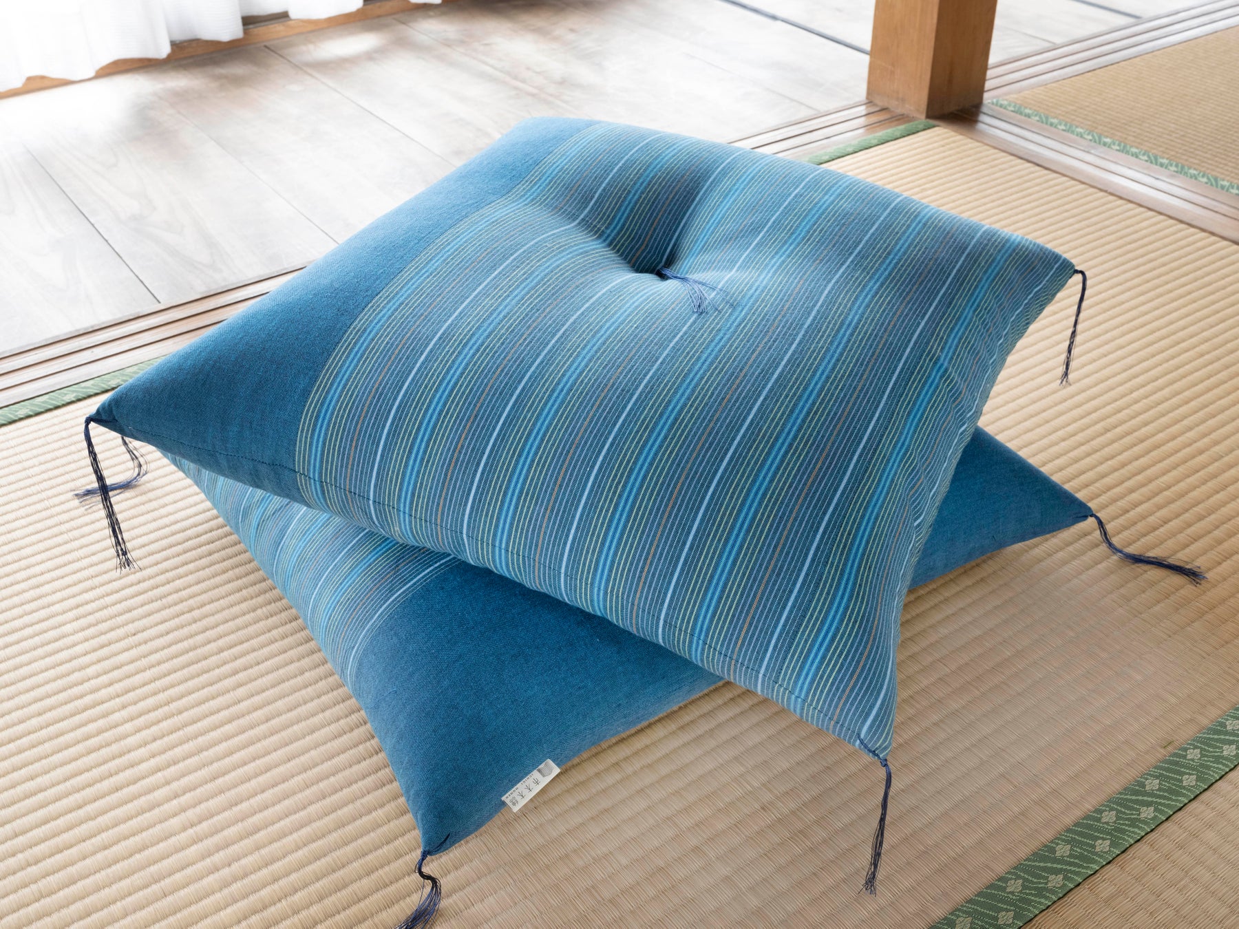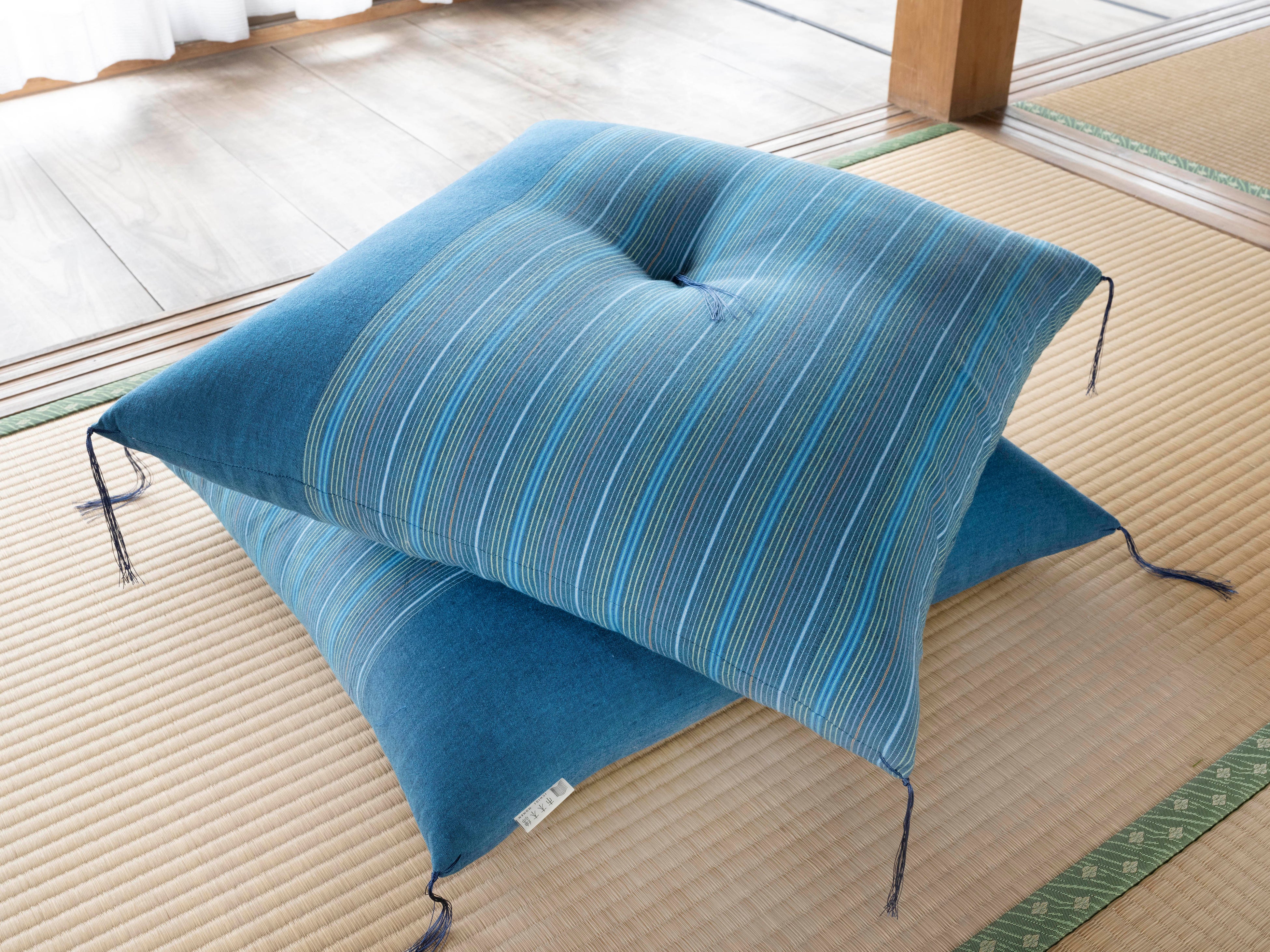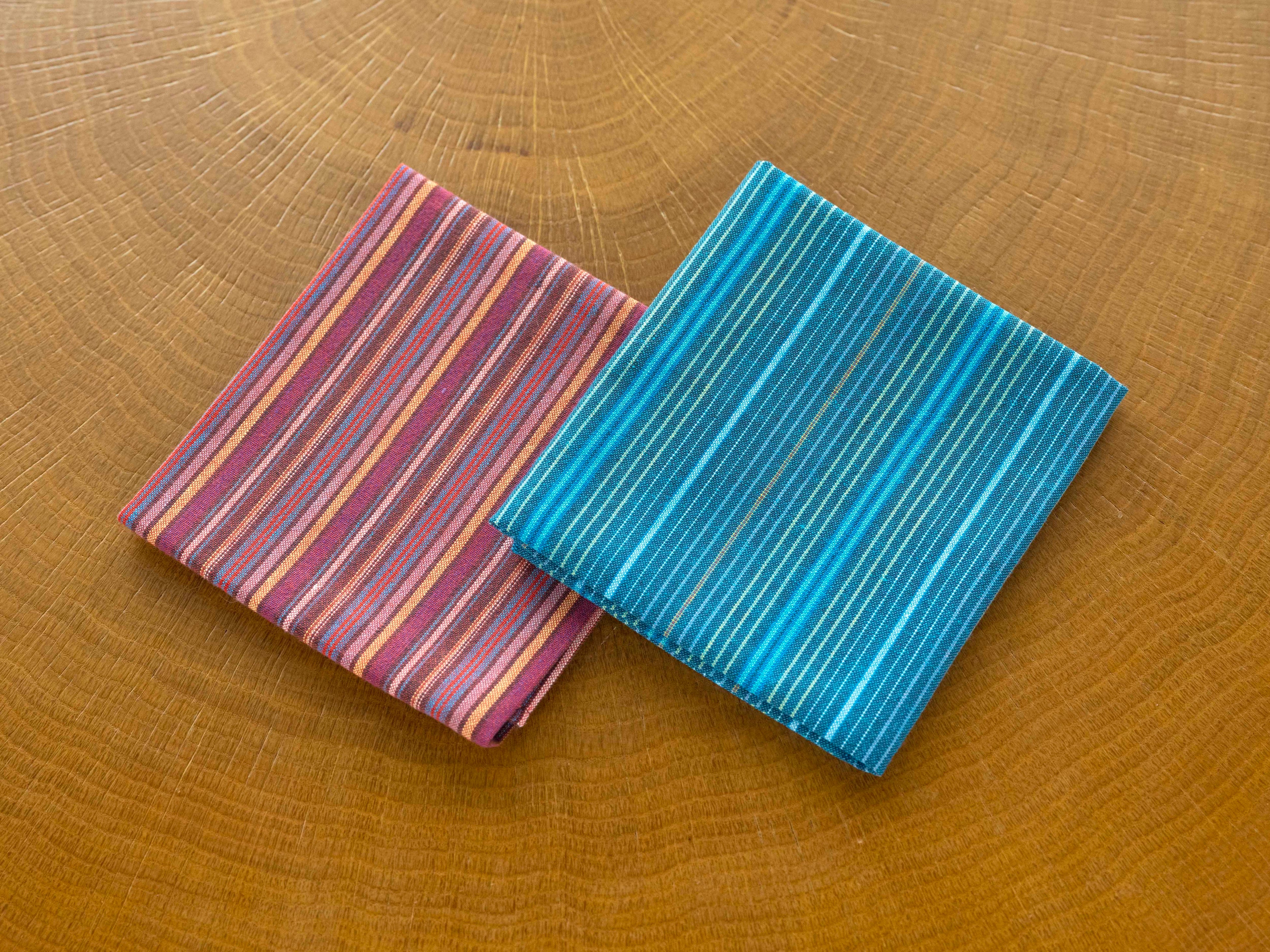 クラウドファンディングで初めて世に出る新しい縞「御浜ブルー」を使用したハンカチや座布団など。