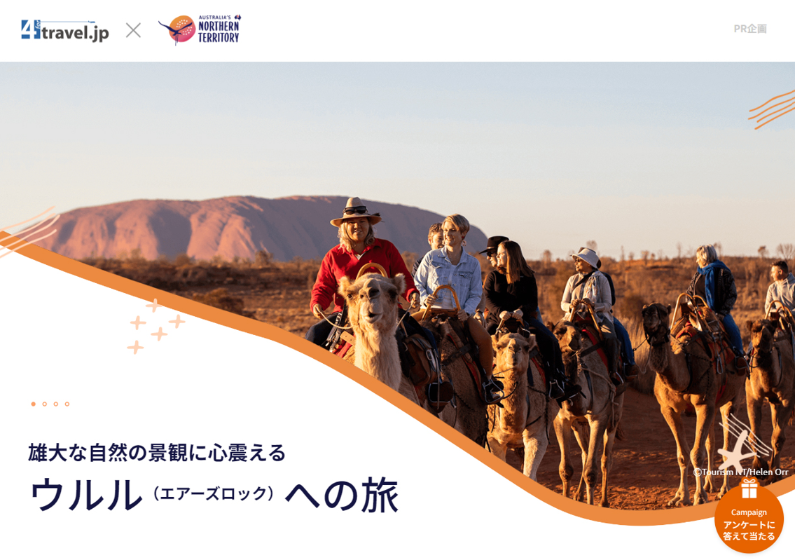 タイアップページでは、世界遺産ウルル(エアーズロック)が位置するノーザンテリトリーの魅力に加え、そこでしか味わえない大自然ならではの楽しみ方を紹介しています。併せて、記事中には魅力的な旅行ツアー商品ページもご案内しています。